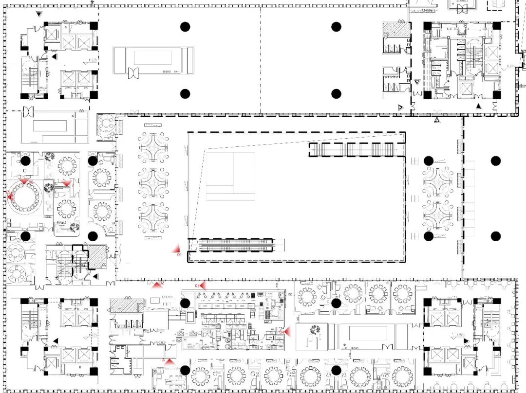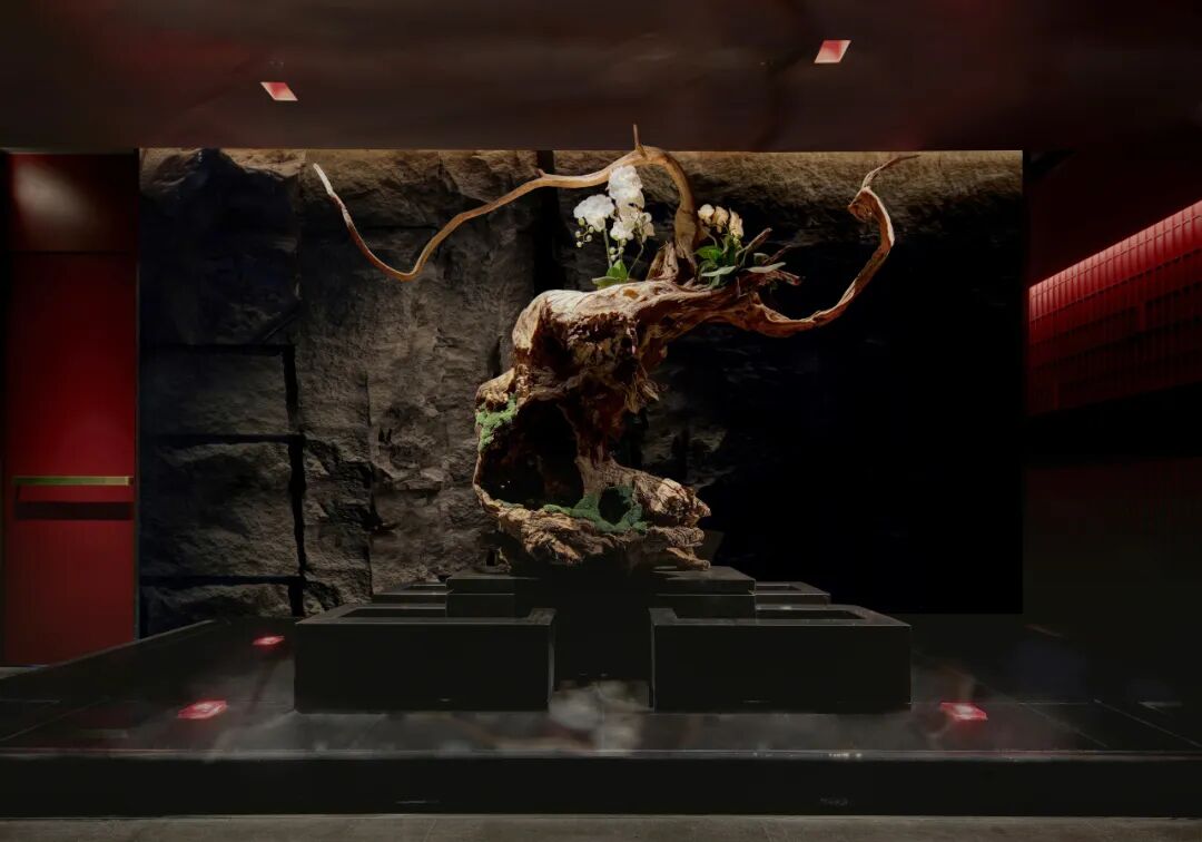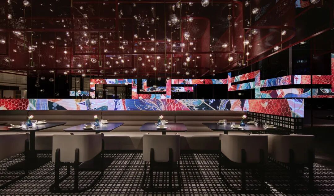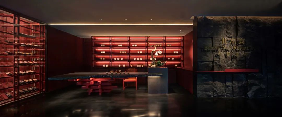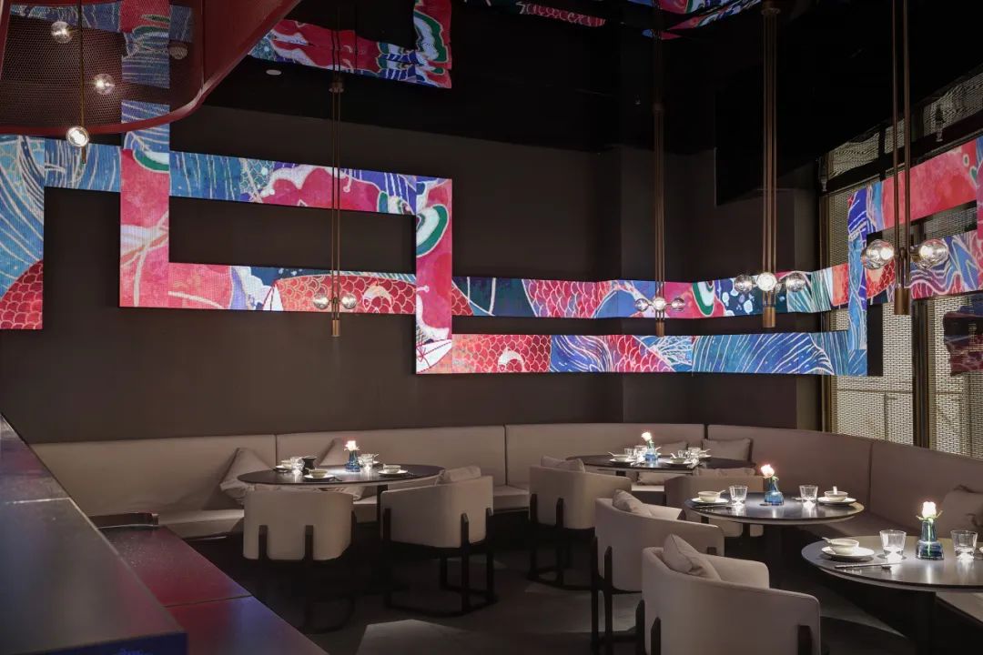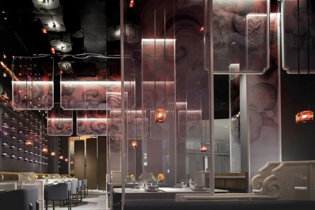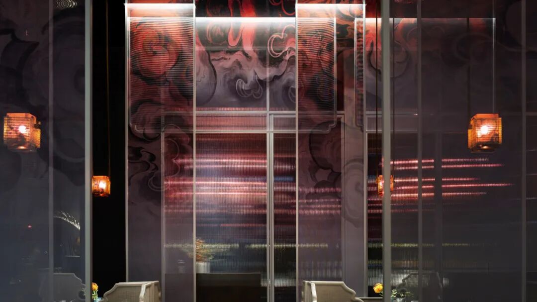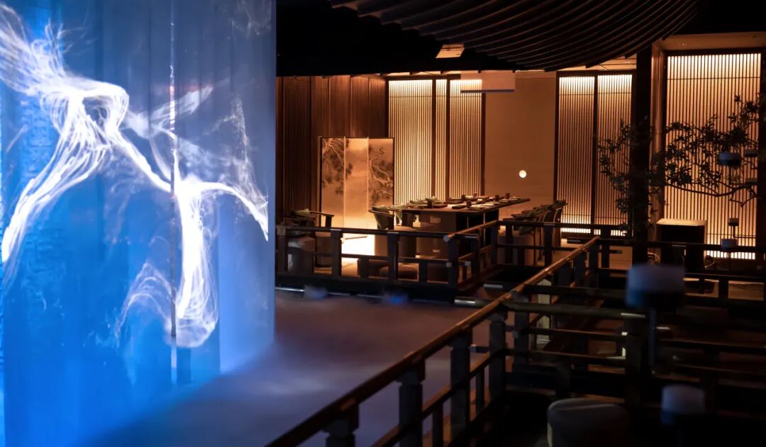 抽象的水火在空间中泼洒纵横,似传统写意画,既是设计师领悟水火之于烹饪的造微入妙,又是中华文明“水”“火”交融的精神写照—火其猎猎,水其柔柔,如火奋发,如水之韧!