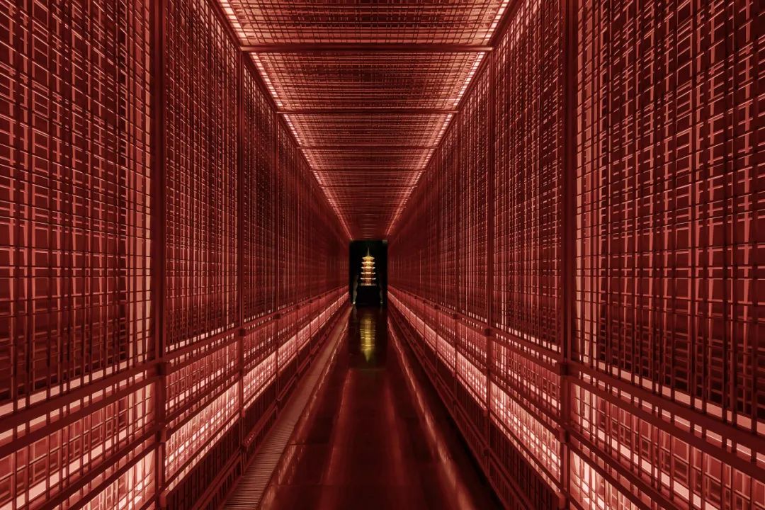 空间设计常因商业特性不免有缺憾,设计师以时空隧道,穿插破局。佛塔点亮尽头,连接时空。