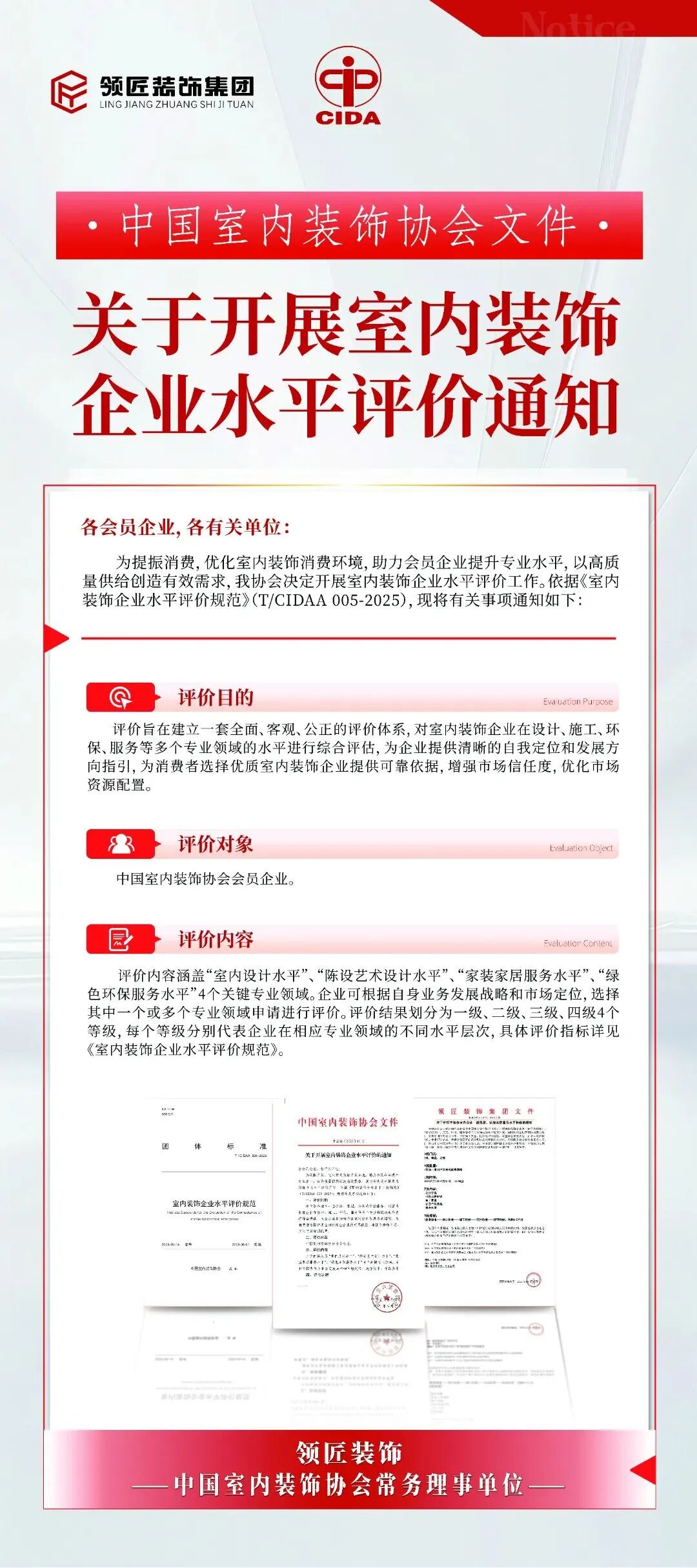 自申报中国室内装饰协会室内装饰企业水平评价“家装家居服务水平(一级)”以来,领匠装饰集团严格对标《室内装饰企业水平评价规范》。该评级要求装企近3年内,累计完成不少于1500 套家装项目,或项目面积累计超过5万平方米。项目涵盖不同价位段,满足多样化的客户需求。通过优质的服务与出色的项目成果,客户满意度高,在区域家装市场具有一定的影响力,拥有稳定的客户群体和市场份额。而领匠装饰集团,不仅完全符合评定标准,部分指标甚至超出评定要求。