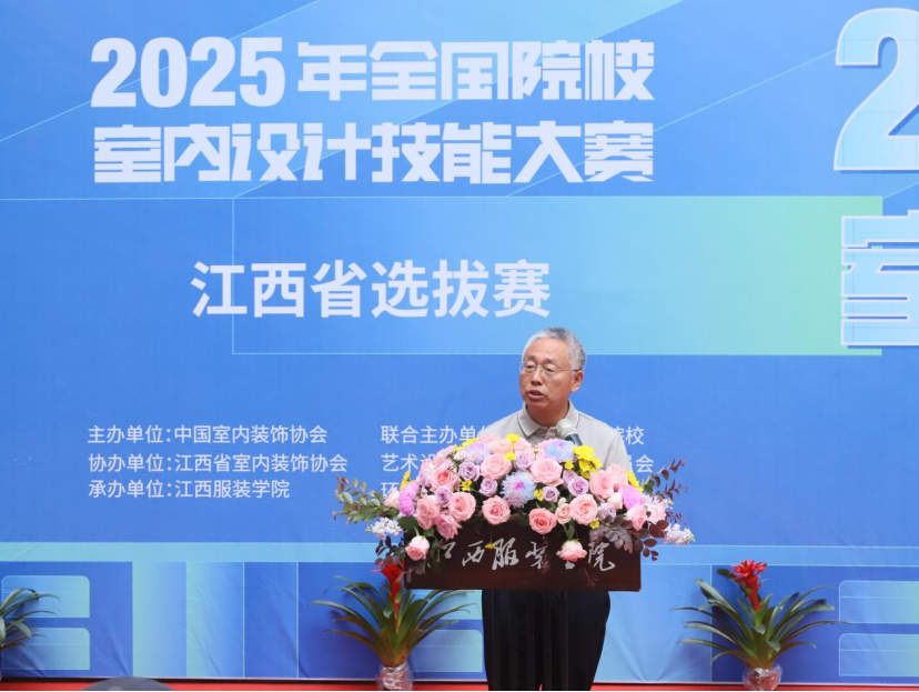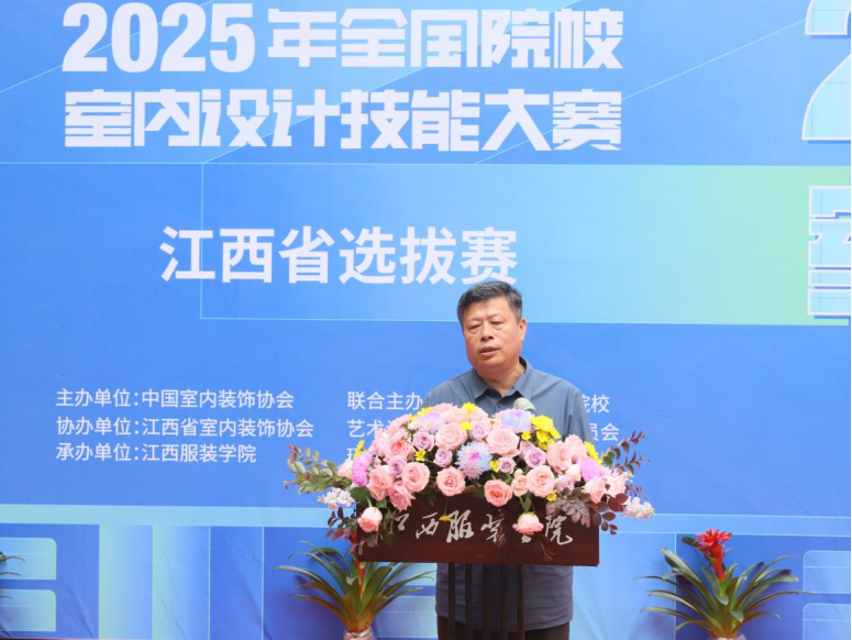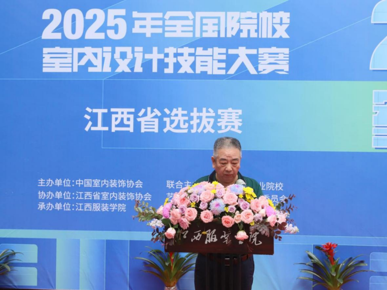 江西服装学院副校长刘孜杰代表承办方致欢迎辞。他表示,室内设计是艺术与生活的融合,要求从业者兼具美学素养、文化底蕴和创新能力。本次大赛为全省学子搭建了展示才华、交流理念的优质平台,将有效促进专业建设与人才培养,推动教育与行业深度融合,培育工匠精神,助力江西省室内设计专业高质量发展。