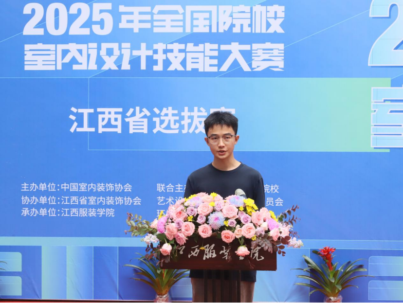 江西服装学院环境设计专业王鑫同学代表全体参赛选手发言,对主办方、指导老师及工作人员表示感谢,并分享了备赛过程中的创意探索与实践收获。他承诺,所有选手将遵守规则、全力以赴,在比赛中充分交流、共同成长。