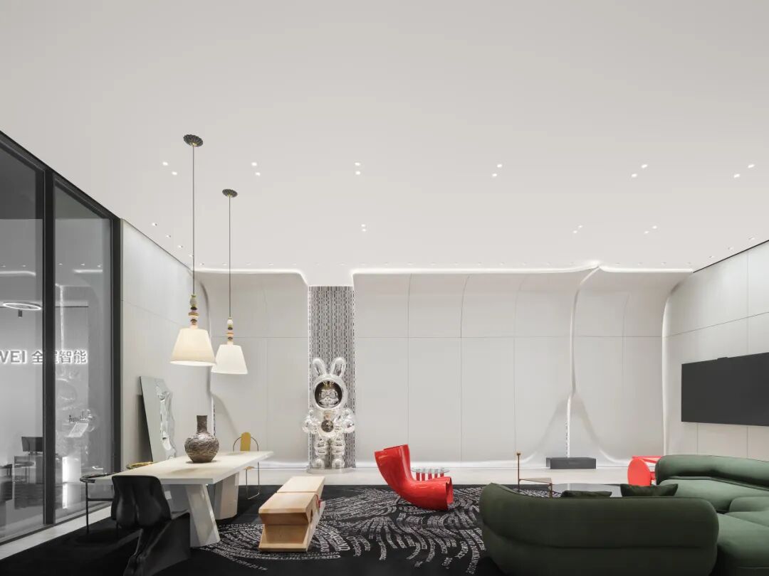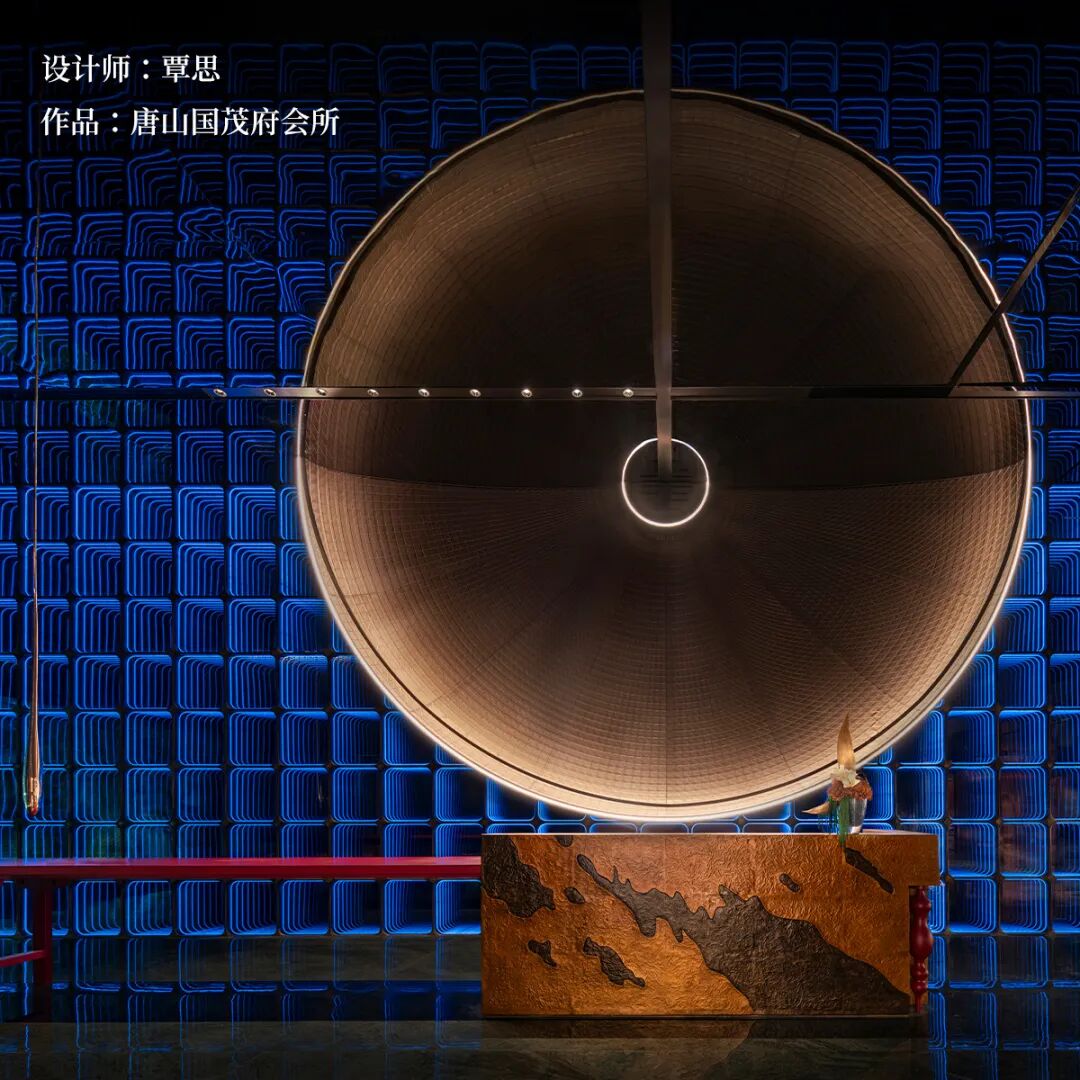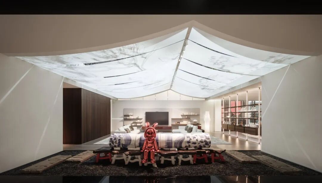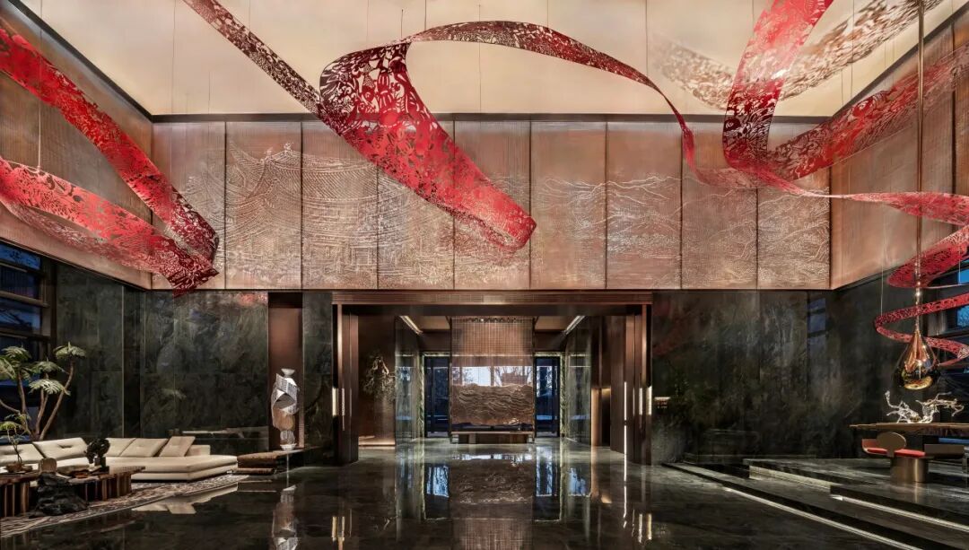 会所的大堂空间设计灵感来源于唐山皮影戏,将其图纹以现代手法转化为装置艺术,创造出文化艺术盛宴。高挑的天花板设计扩展视觉空间,营造开放氛围。空间中巧妙融入皮影戏图案,天花上的影子仿佛置身戏剧舞台,提供沉浸式体验。