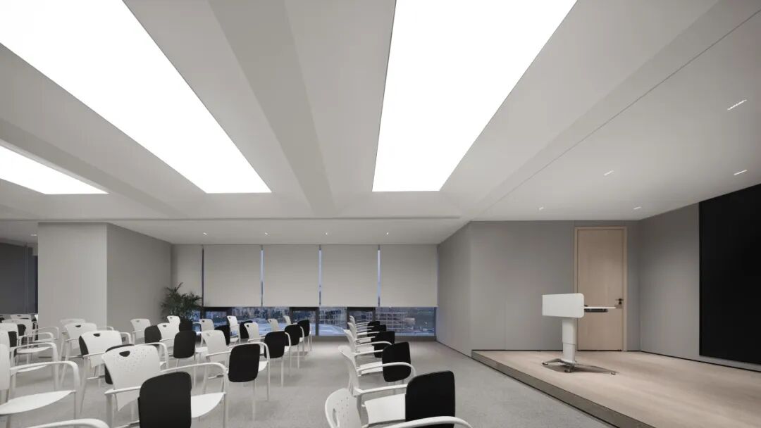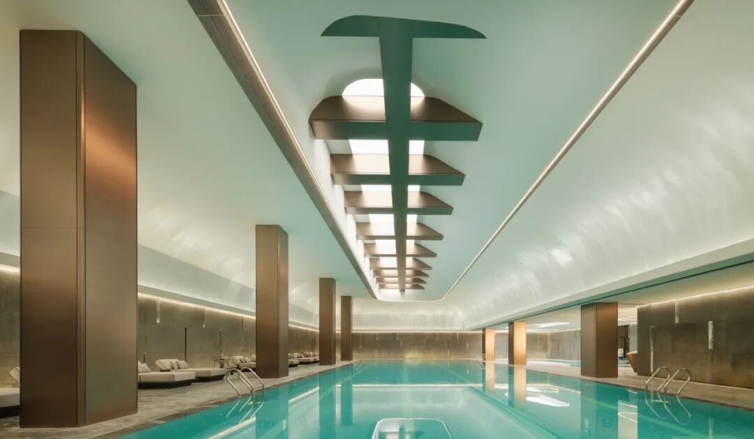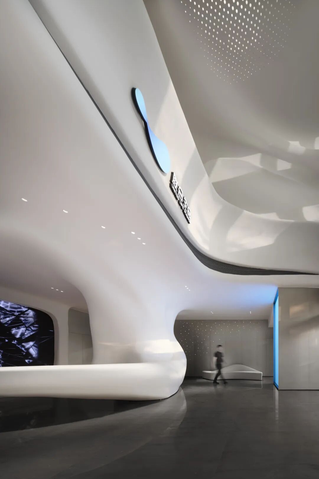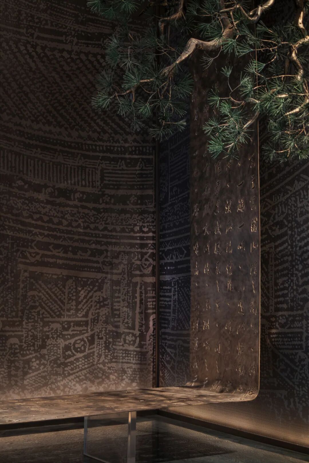 会所的大堂空间设计灵感来源于唐山皮影戏,将其图纹以现代手法转化为装置艺术,创造出文化艺术盛宴。高挑的天花板设计扩展视觉空间,营造开放氛围。空间中巧妙融入皮影戏图案,天花上的影子仿佛置身戏剧舞台,提供沉浸式体验。