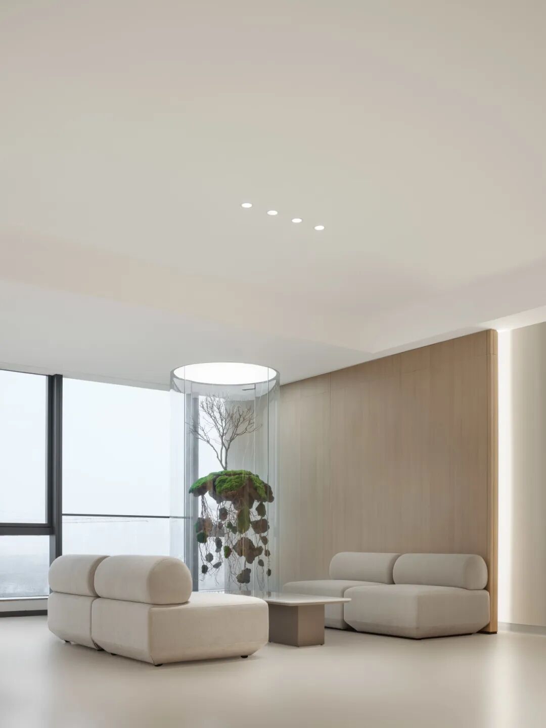 原建筑由不规则的空间组成,设计以建筑的弧形发散空间,解决功能需求的同时,保证空间的完整性。此外,选材以绿色科技为核心,如卫生间使用了净悦板、洗烘一体的水龙头、以及免冲水马桶等。