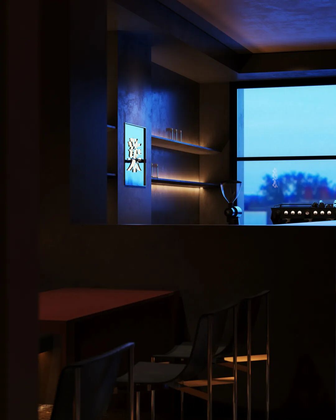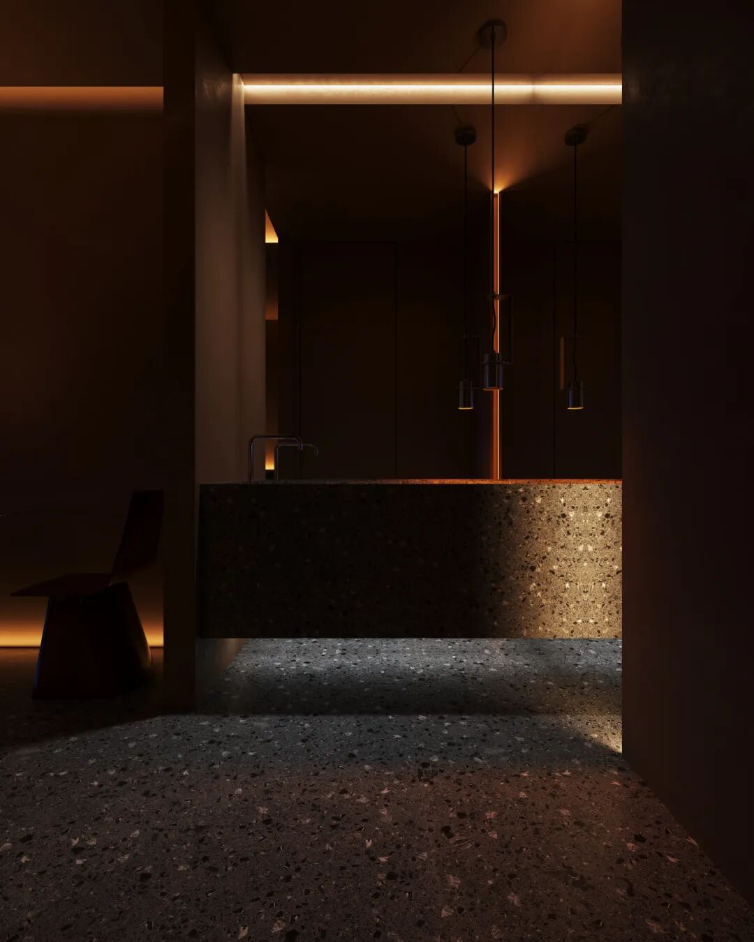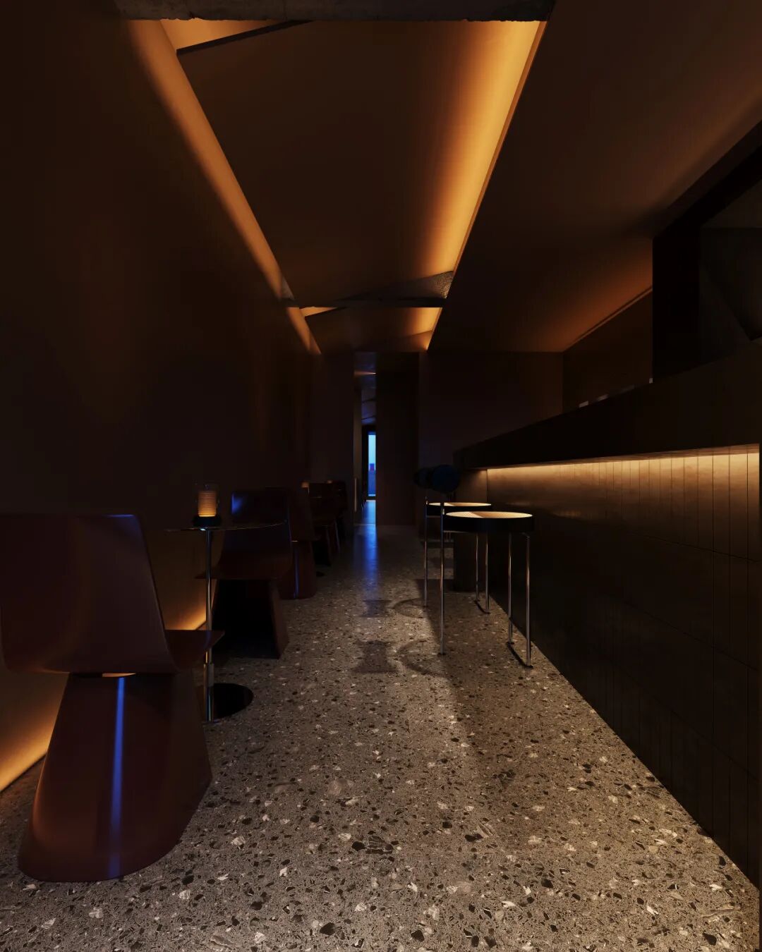 ”让空间成为盛放情绪的容器“整个店铺秉持简而不凡的设计逻辑,几何线条贯穿空间。恰当运用灯带和点状光源,将气氛由日里的馥郁咖啡香过渡轮转至夜间微醺沉溺的酒香。从房梁到墙面都采用了颇具质感的石材和肌理感艺术漆。当藏于背匿处的暖光打在斑驳的表面上,时间仿佛于此尽情流动又相对静止。街外的路人行色匆匆,步入其间却让人情不自禁放缓步调。齐晟认为,在商业空间中消费者的心情是不同于居家或者办公空间的。设计师需要捕捉更多的情绪状态,并由此提高体验阈值。大到整体空间的延展性,小到桌子的边缘,椅背的倾角,都是细节。而细节则构成了整个设计的完整性。