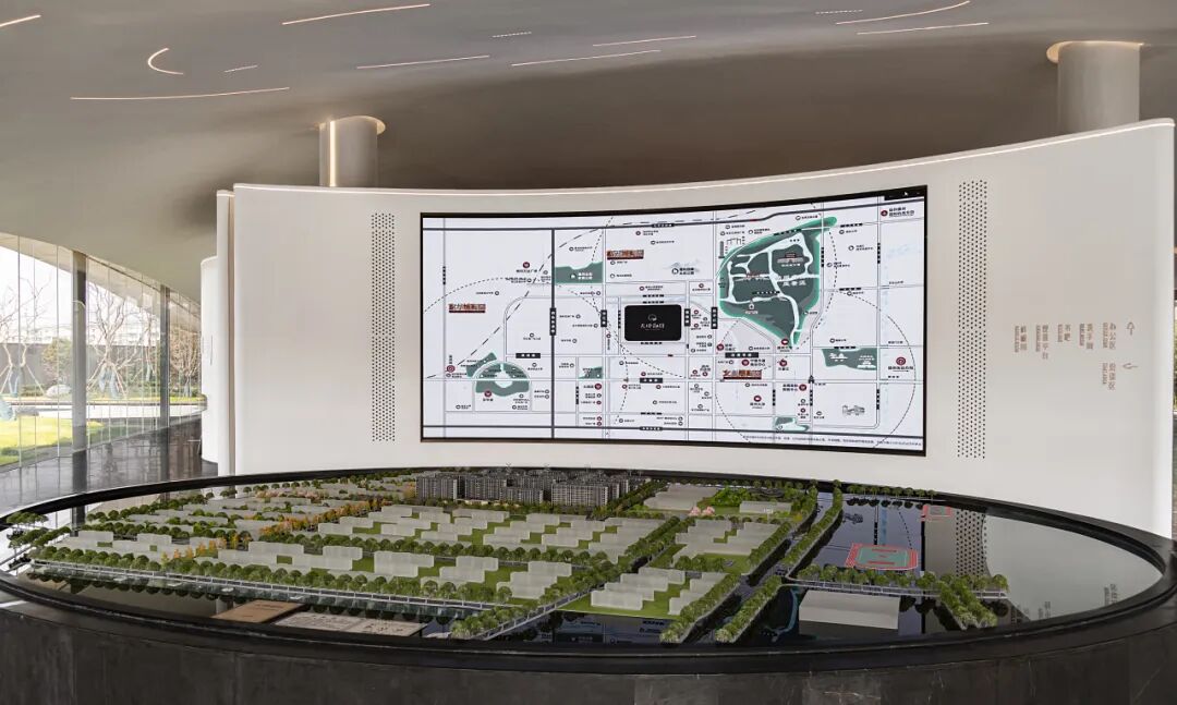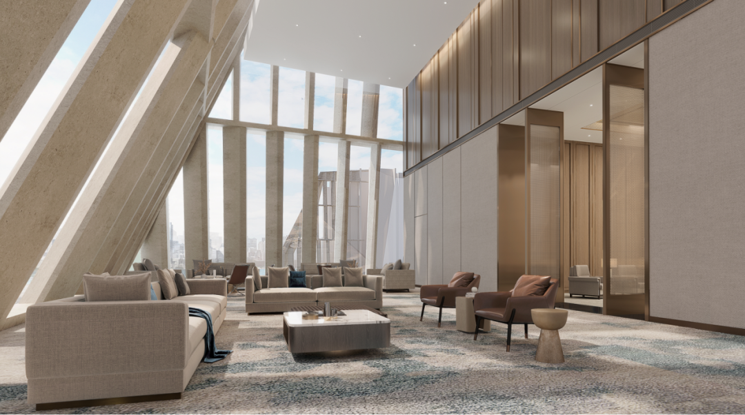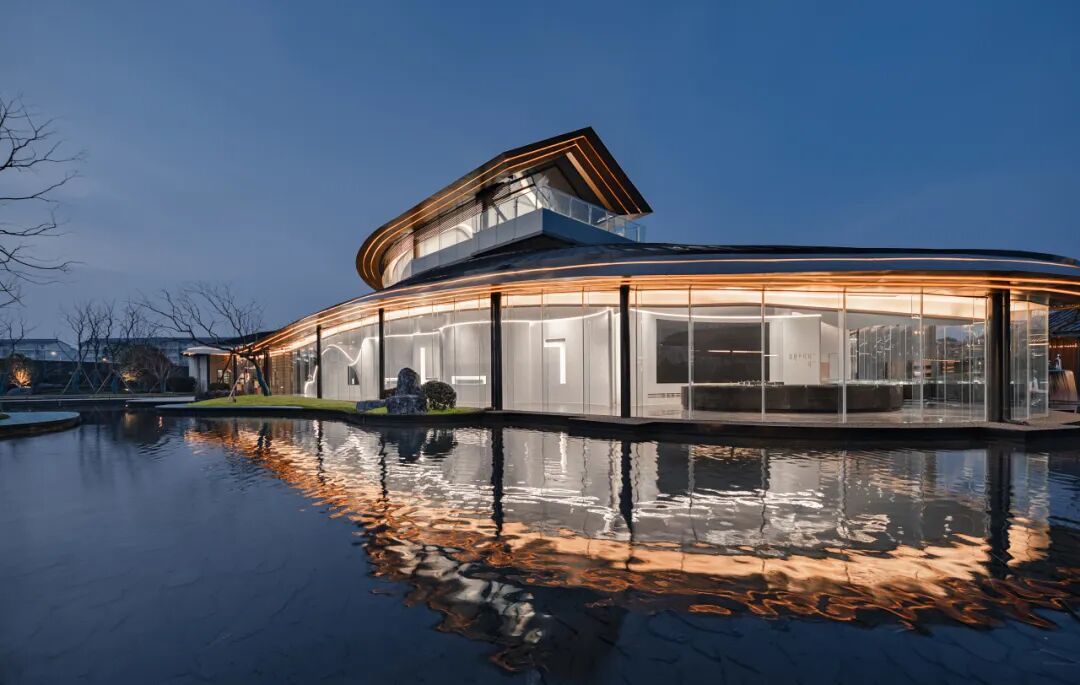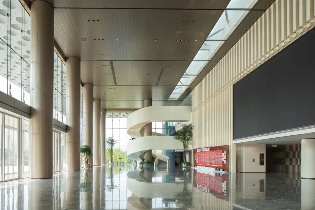 本案建筑形体为异形,为了更好的凸显建筑形体特点与最大化四周玻璃幕墙的通透感引外景入内室。