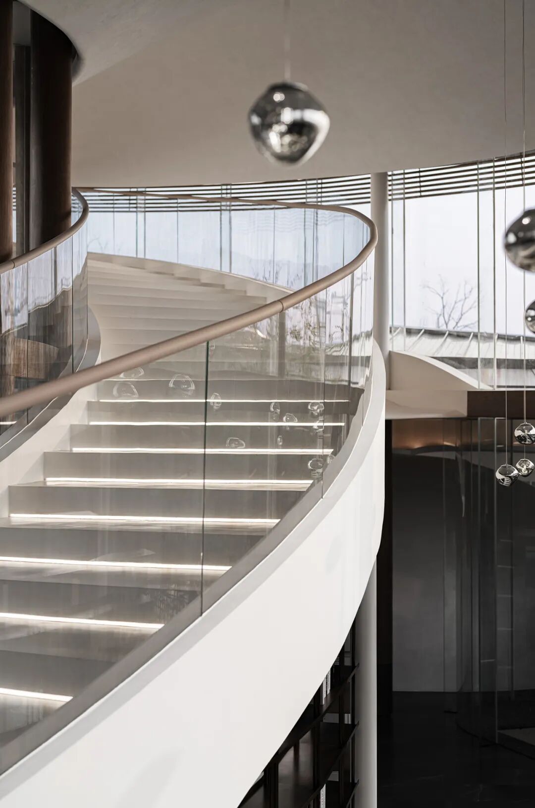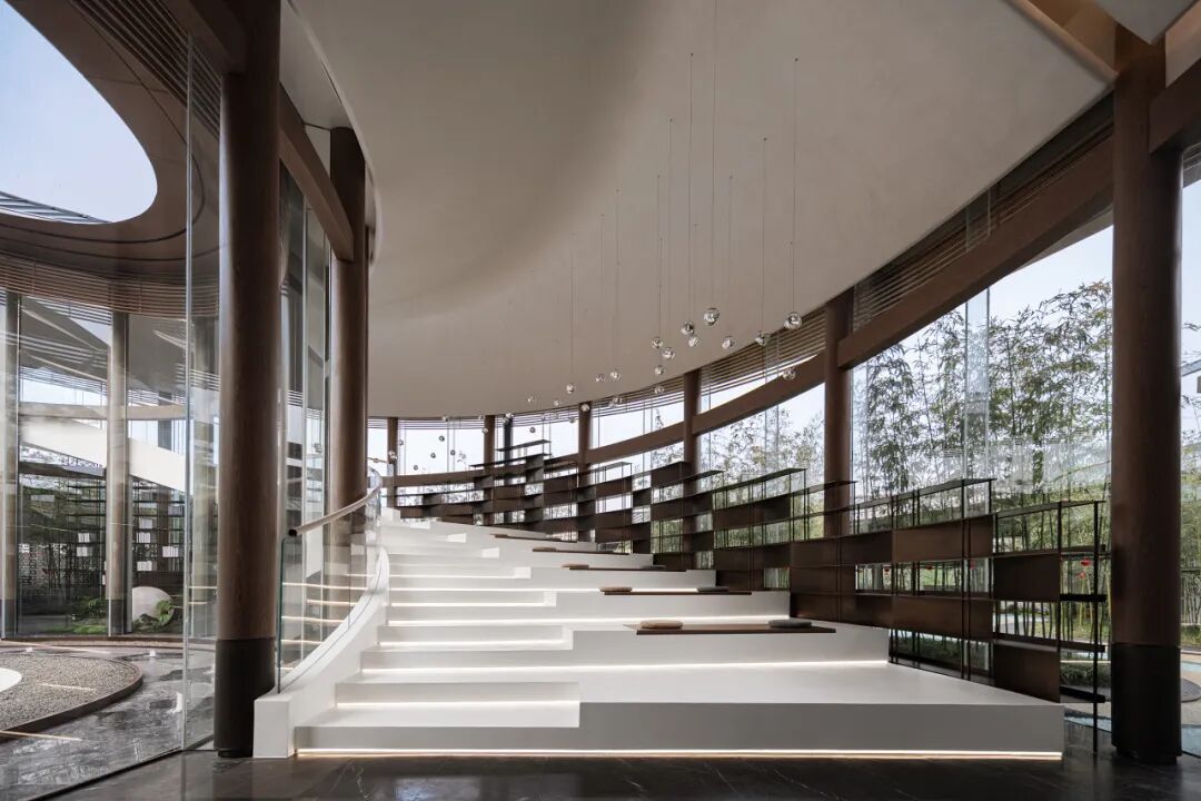 一层与二层悬挑平台由面宽5.2M的旋转楼梯盘旋而上,设计师利用特殊漆区分地面与楼梯空间的分界,创造性的将阅读区纳入旋转楼梯,赋予其复合的功能并创造出让人留下深刻回忆的记忆点。旋转楼梯环抱中央景观,洽谈区与休闲区环绕景观中庭,依托建筑中央无顶的优势,营造出“四水归堂、围炉听雨”之情境,利用现代手法表现中式风骨。