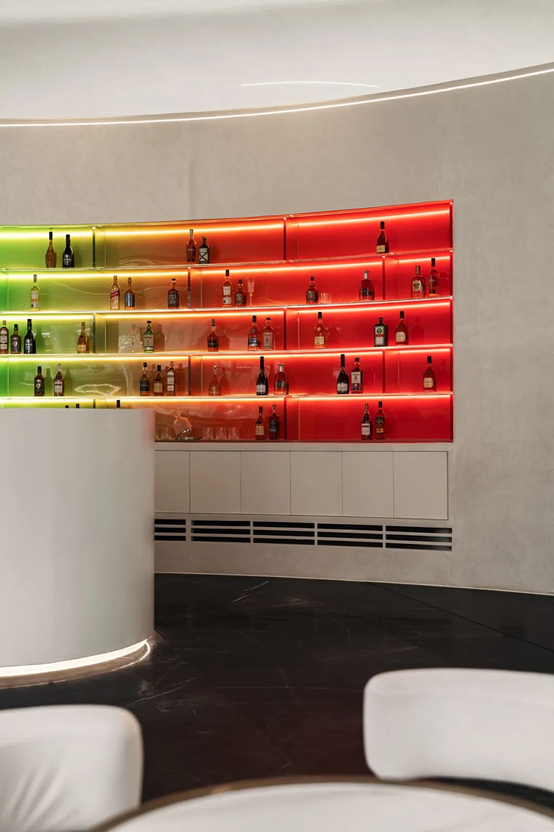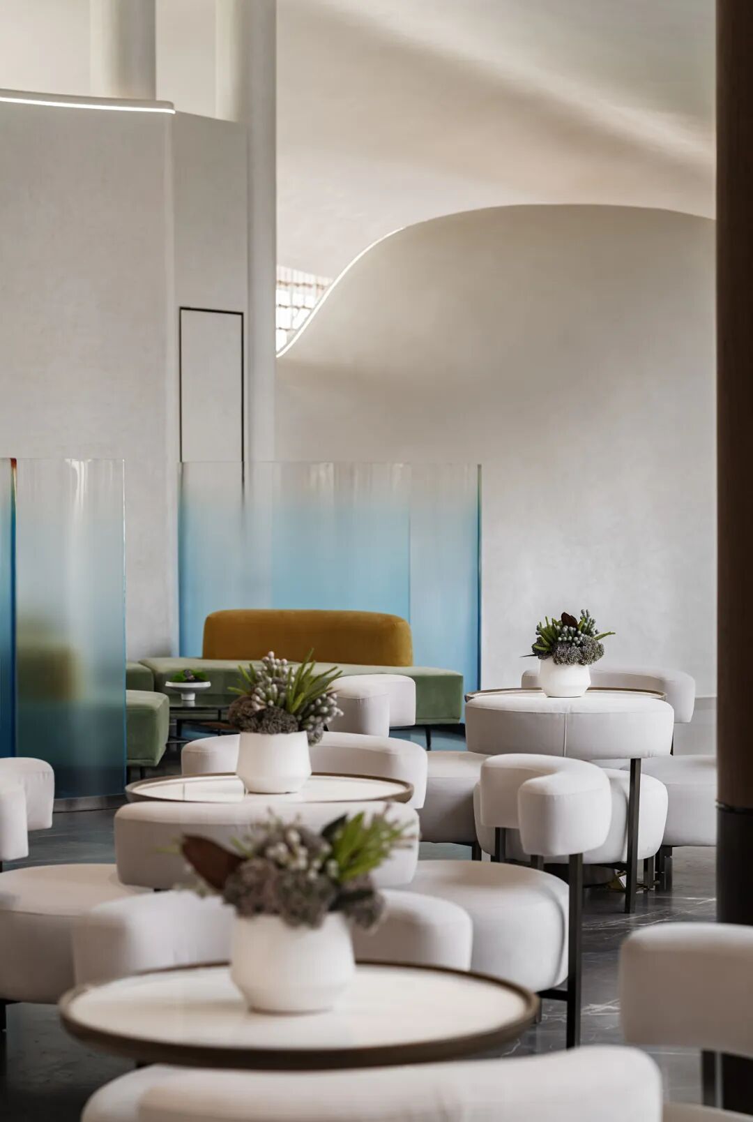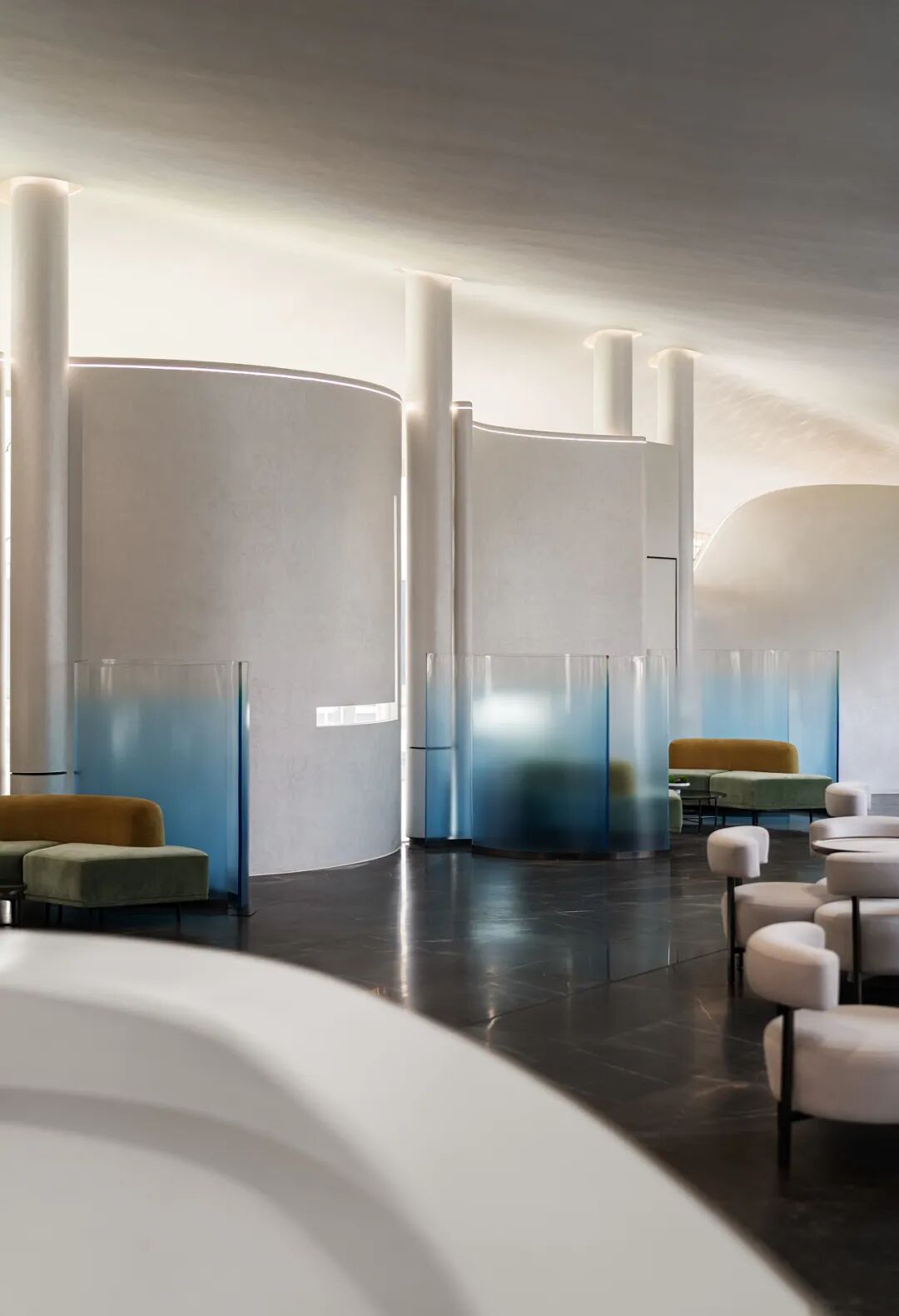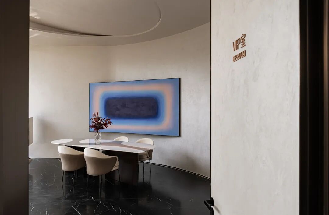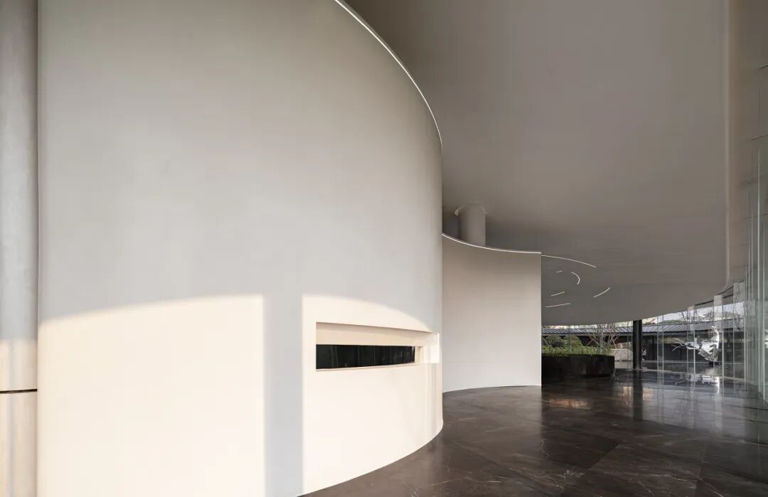 本案主创设计师采取室内建筑的概念,将多数梁柱用造型形体环绕包裹,延伸的曲率让平面形成进退关系,构筑出一条艺术长廊及隐藏在长廊拐角处的通道。创造穿梭其间蜿蜒幽静的路径,搭配连贯的中性色介质,让情绪禁止的内蕴力量缓缓而升在室内最佳观景点达到高潮。纳室外环绕景观“一里瘦西湖”景入室,续写“避世桃花源”之意境。路径上布有此端彼端的窥望层次,沿着墙、循着光,在廊道的尽头找到令人豁然开朗的“桃花源”。
