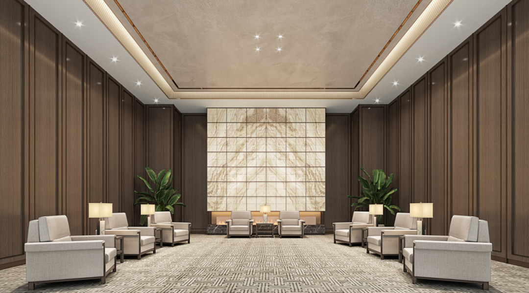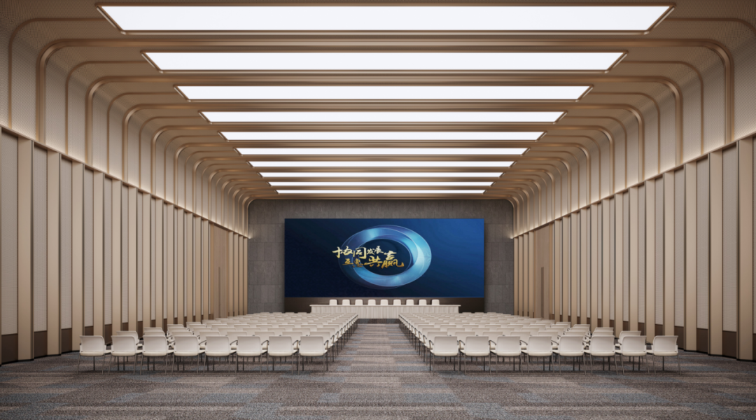 这四个字的含义也涵盖了艺术、建筑、宇宙等远思的深邃。我们将太湖石的八面玲珑的形态结合到了会议中心的整体设计中,将赏石中的哲学运用到了建筑室内层面上,从内涵到造型进行了全新的诠释。