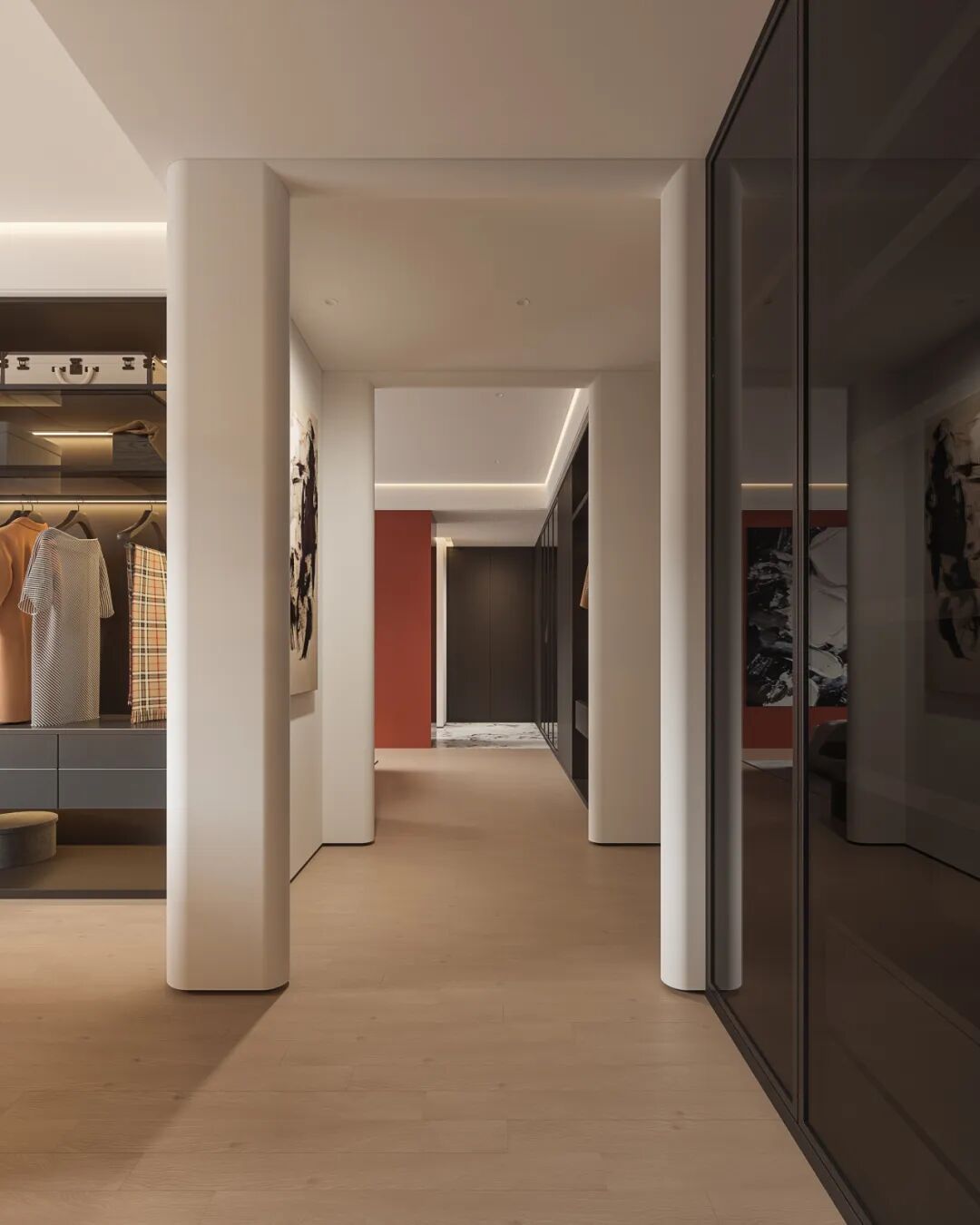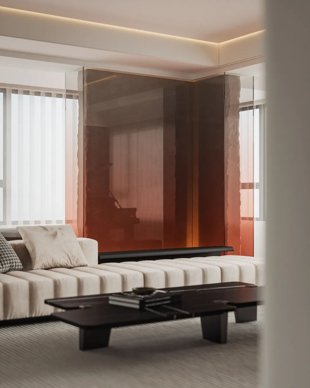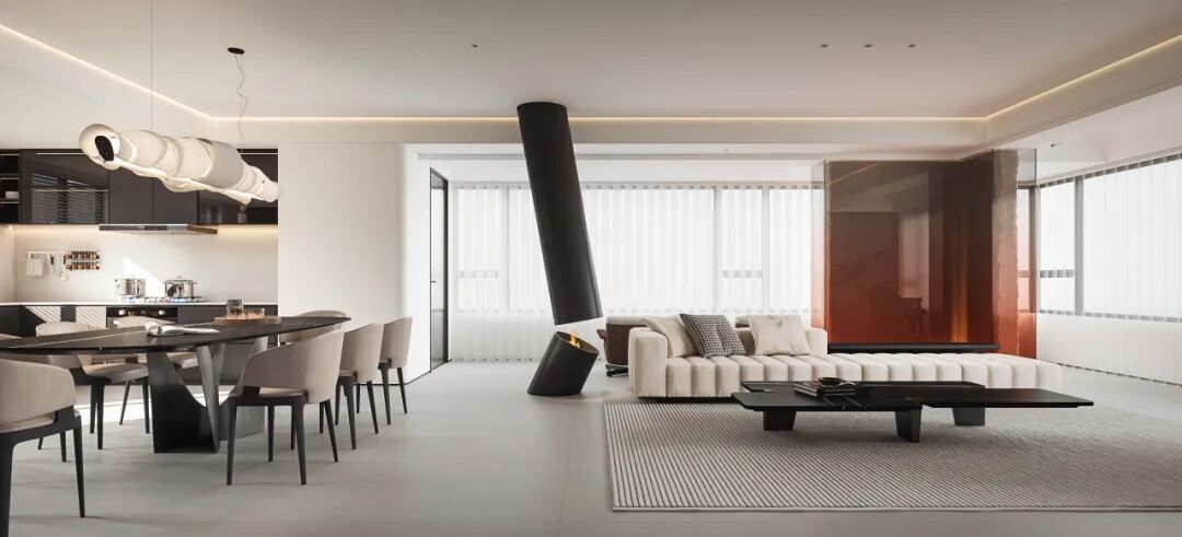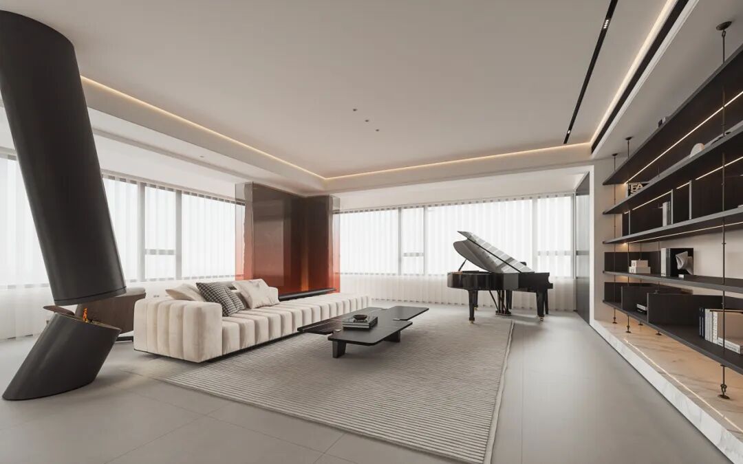 此现代极简设计,以黑白灰为主体色调,搭配温暖的木色木地板。胭脂红艺术漆的融入,画龙点睛。客厅中,红色渐变玻璃包裹剪力墙,形成强烈视觉冲击。取消电视墙,换上开放格书架,文化气息满溢。三角钢琴与筒状仿真火炉的置入,营造出优雅且温馨的环境,让艺术与生活在此完美融合。