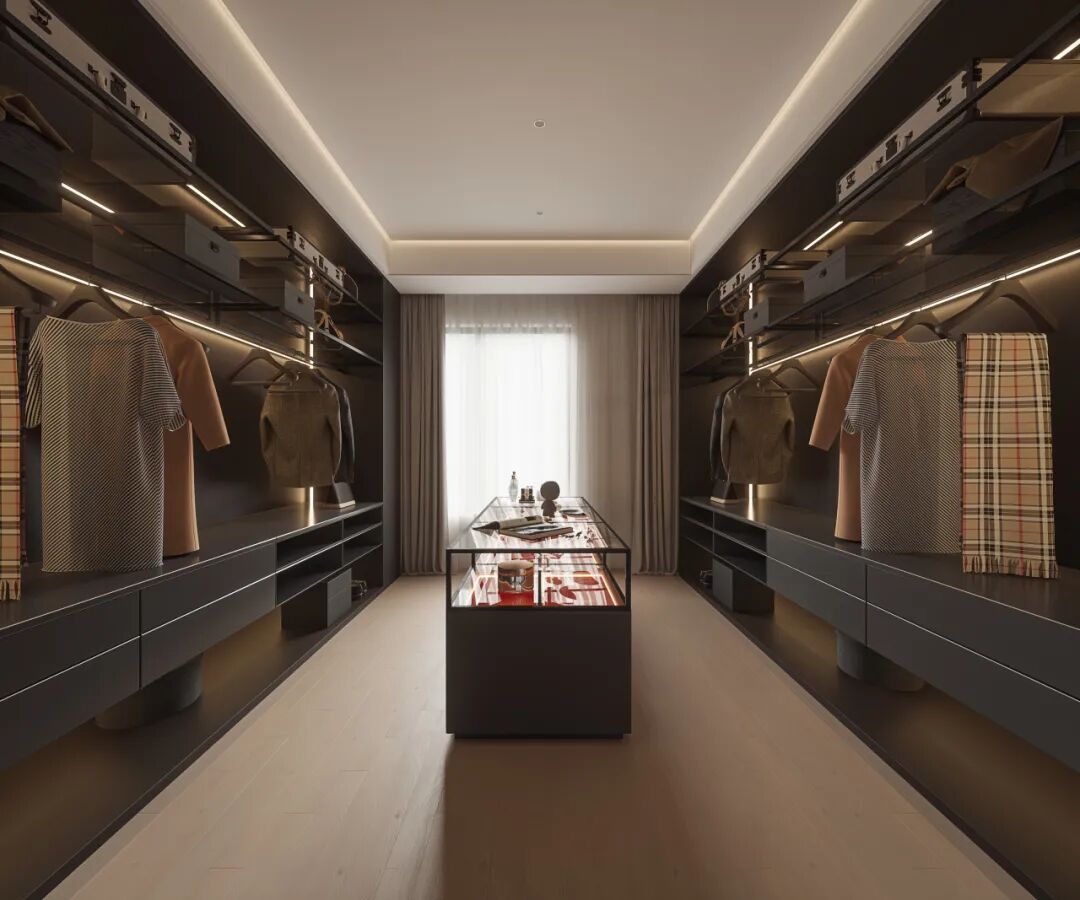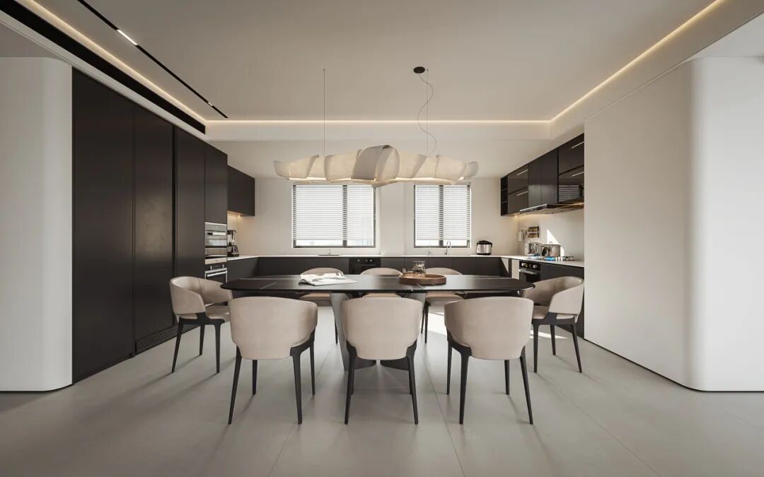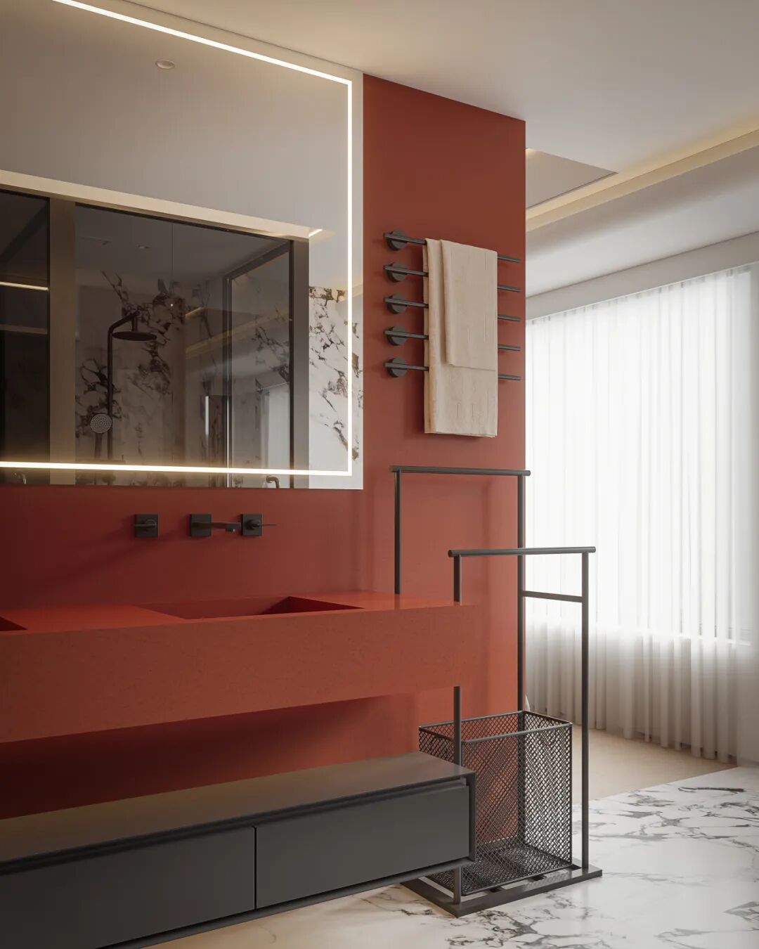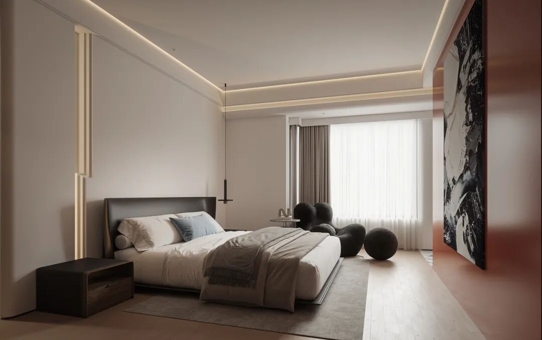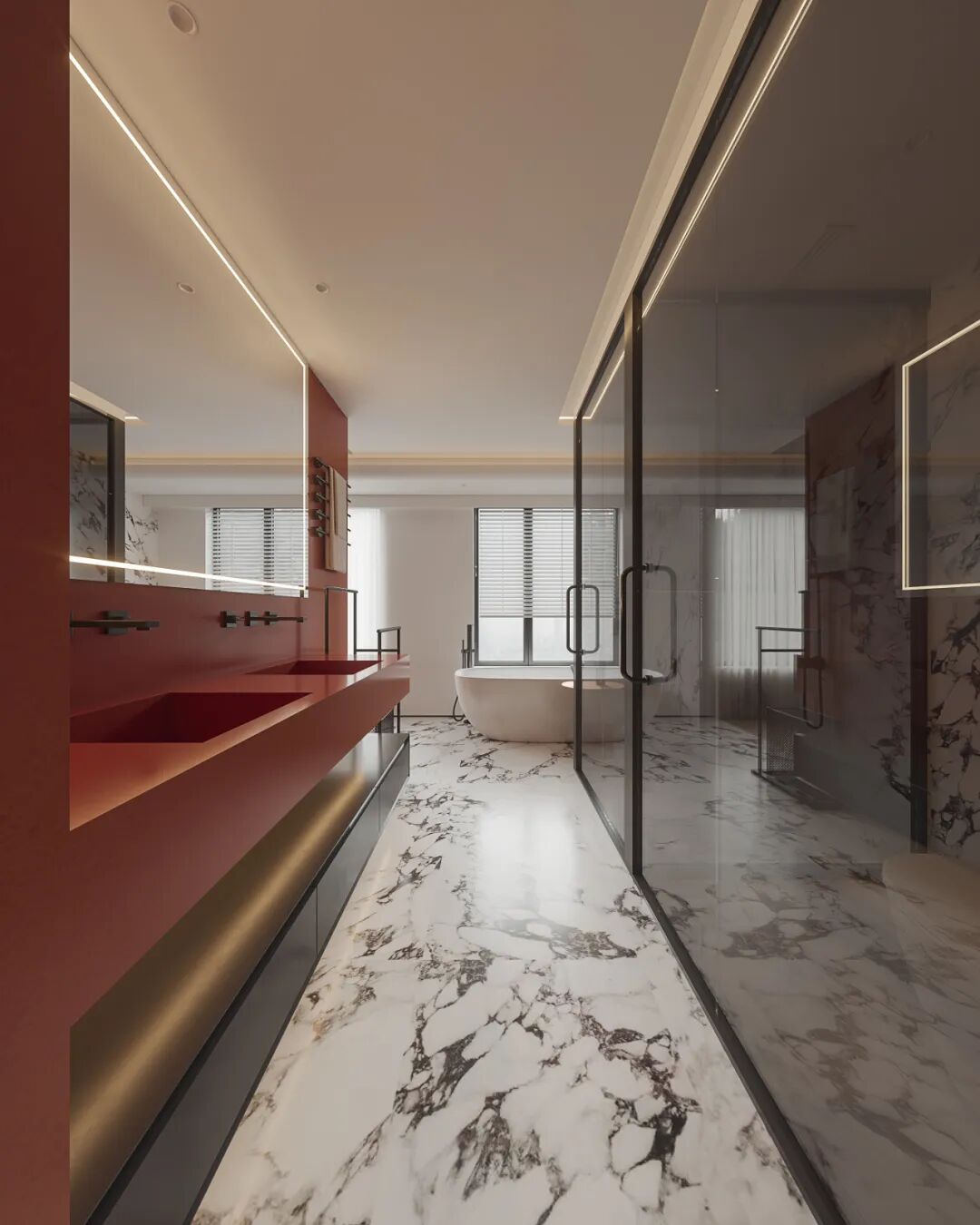 此现代极简设计,以黑白灰为主体色调,搭配温暖的木色木地板。胭脂红艺术漆的融入,画龙点睛。客厅中,红色渐变玻璃包裹剪力墙,形成强烈视觉冲击。取消电视墙,换上开放格书架,文化气息满溢。三角钢琴与筒状仿真火炉的置入,营造出优雅且温馨的环境,让艺术与生活在此完美融合。
