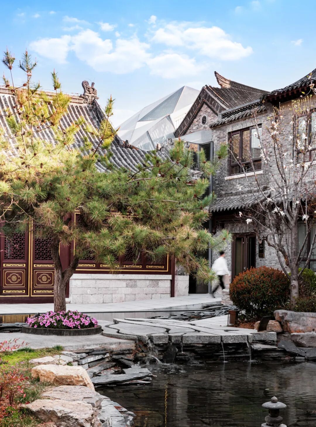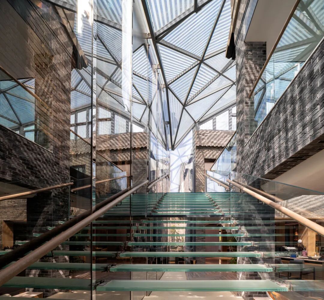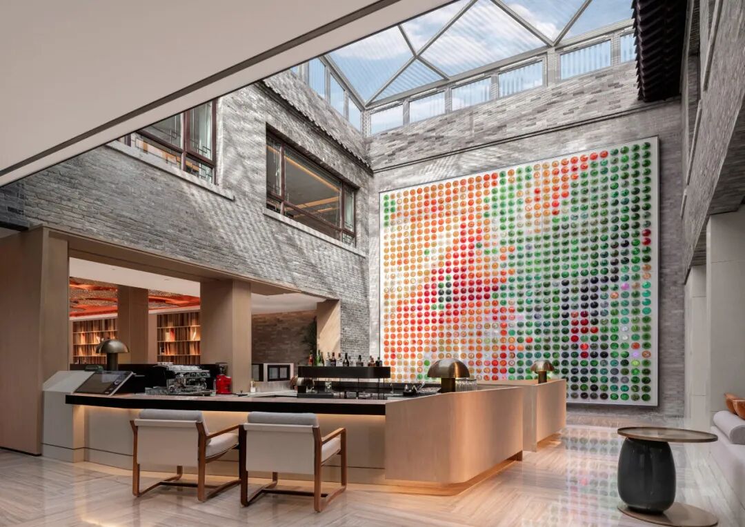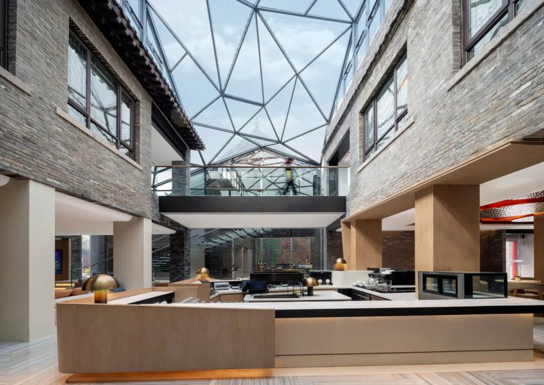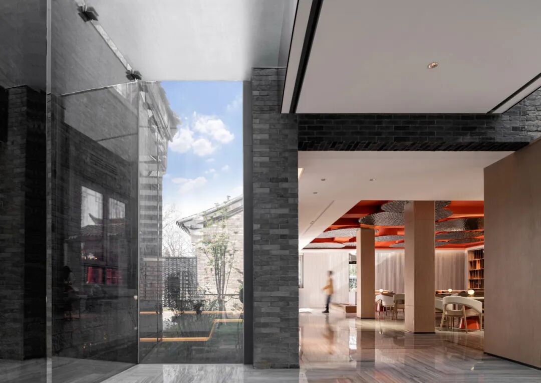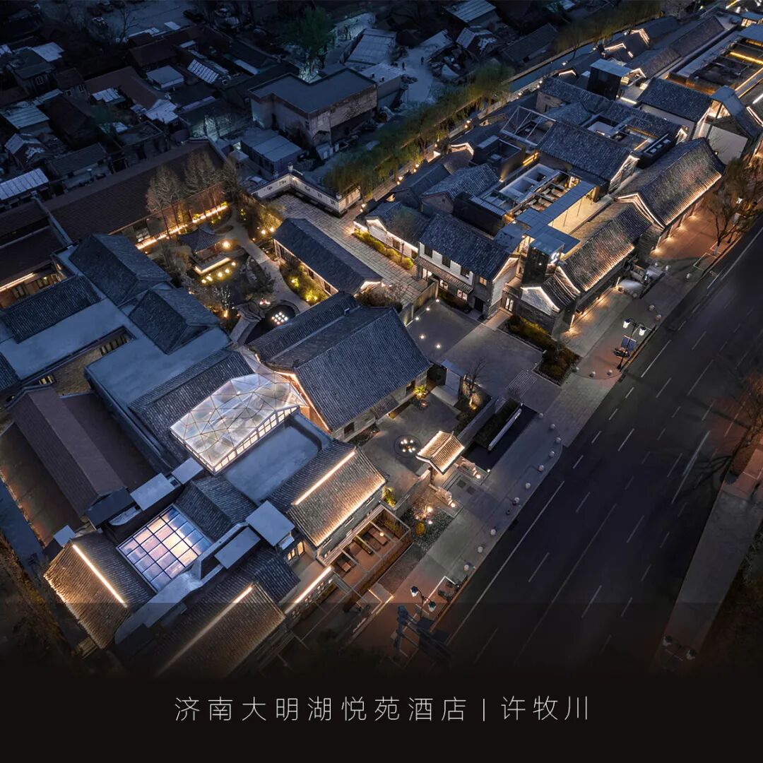济南悦苑酒店位于山东省济南市百花洲传统街区,青瓦黛墙的传统四合院,垂柳和泉池间,游人如织,描绘出一幅老济南的优美画卷。本项目主体前身是济南江西会馆,涉及一座板梁结构的仿古建筑、两座保留下来的历史文化保护建筑,以及部分旧厂房,占地约9800㎡,设计面积约16200㎡。改造设计在“故园新知”设计理念中,结合江西会馆的特殊意义转译济南传统文化元素,建构新的形式框架,赋予原建筑场地崭新的构成、材质与肌理。
