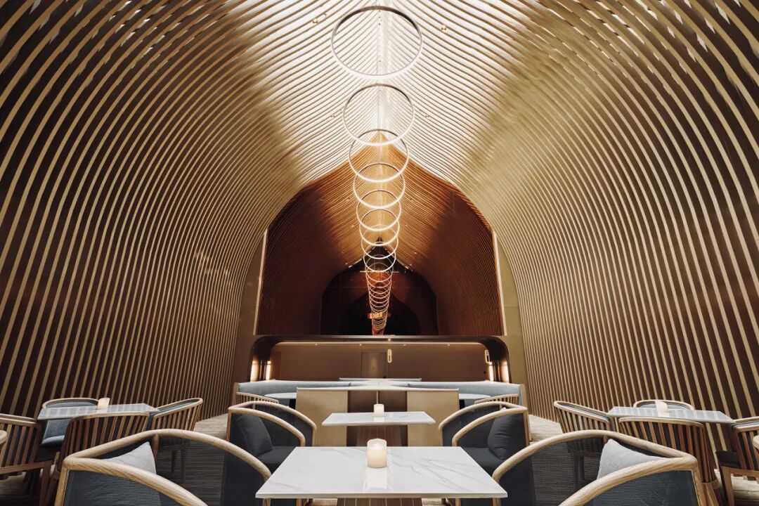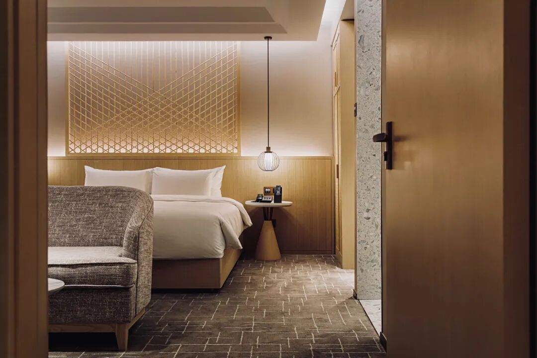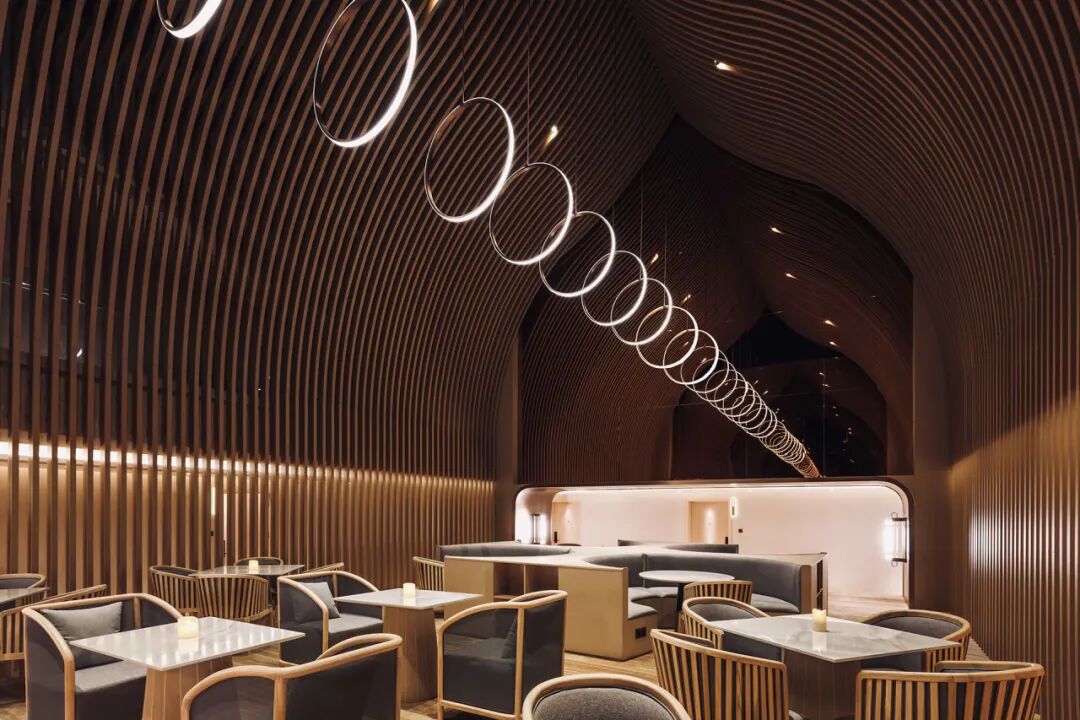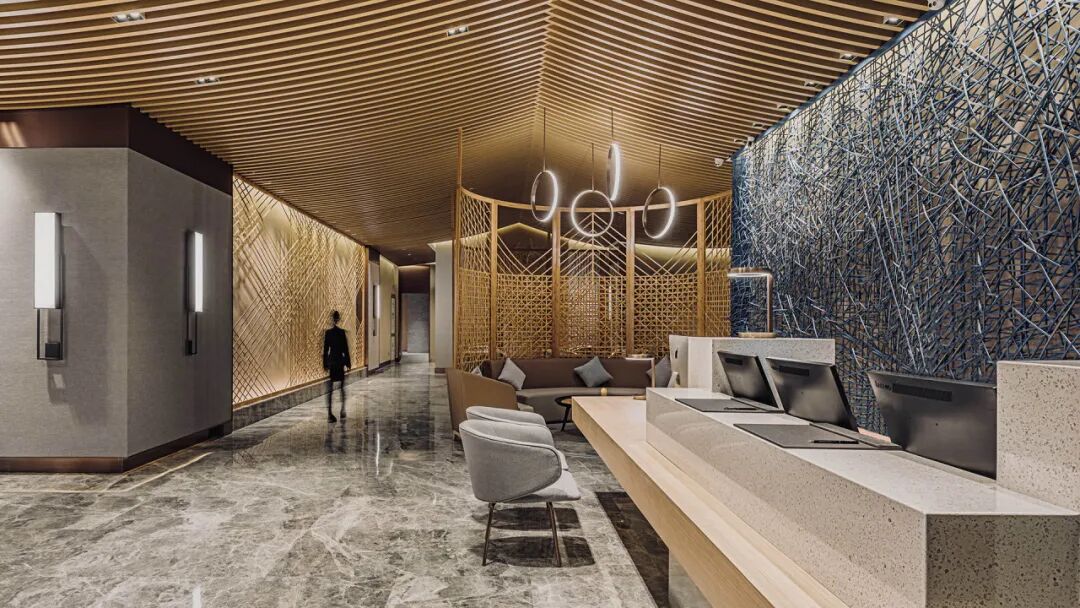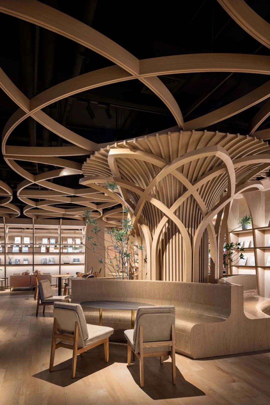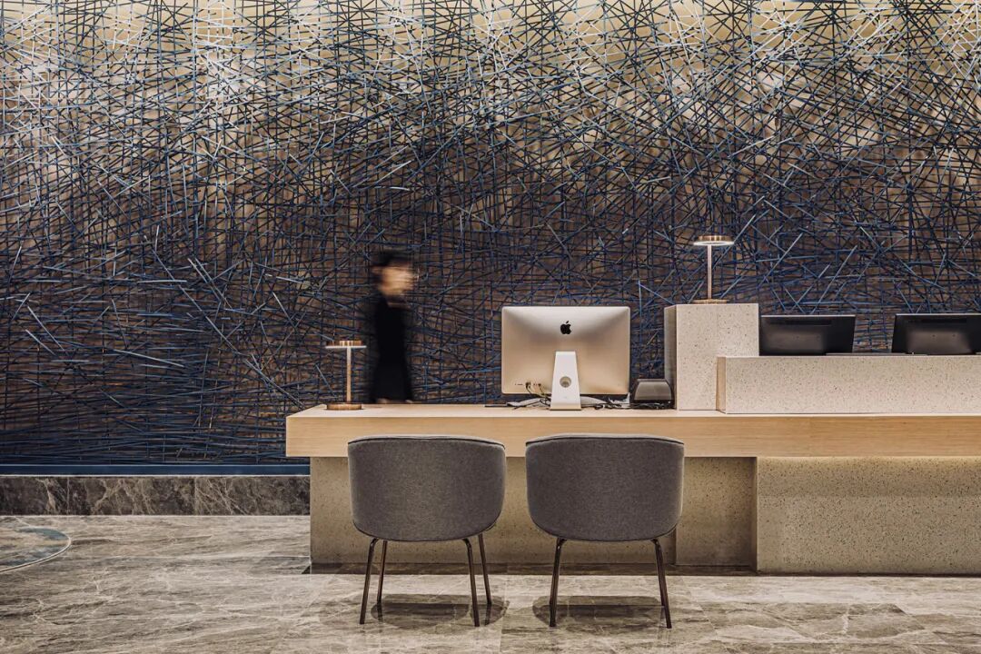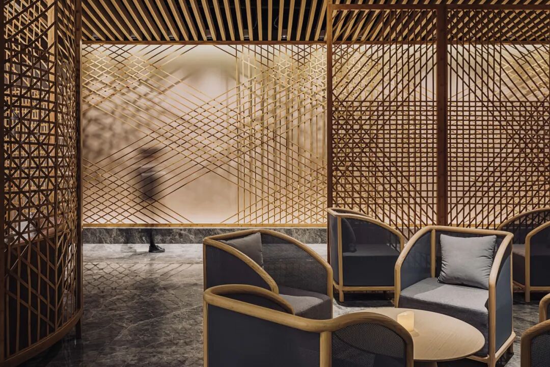 从大厅开始,竹子被选为主要材料,让顾客进入大厅,并受到主墙上精美的光影效果的欢迎。使用传统的竹织机进行了各种现场测试和实验,以创建全高屏风,以定义接待区和大堂休息区。倾斜的屋顶天花板和自然的硅藻泥饰面墙,通过铰接的光影效果叠加在一起,为整个空间提供最小的休闲体验。