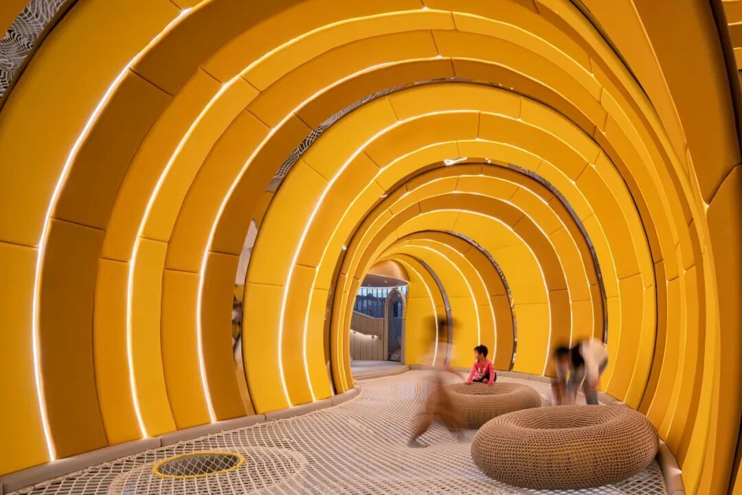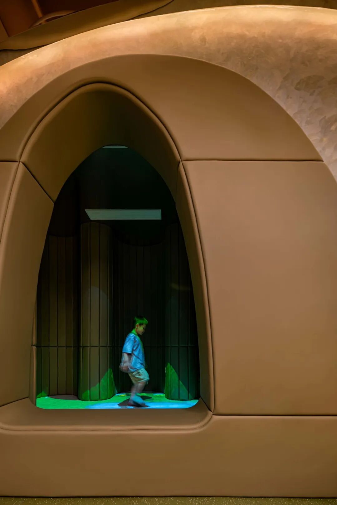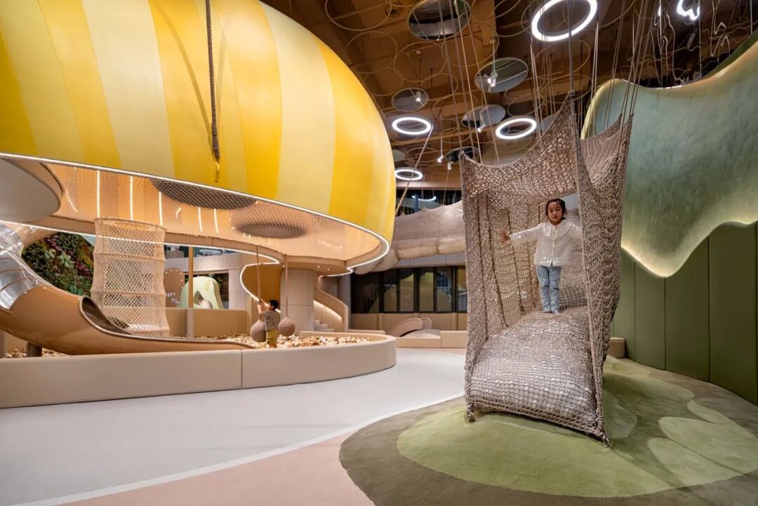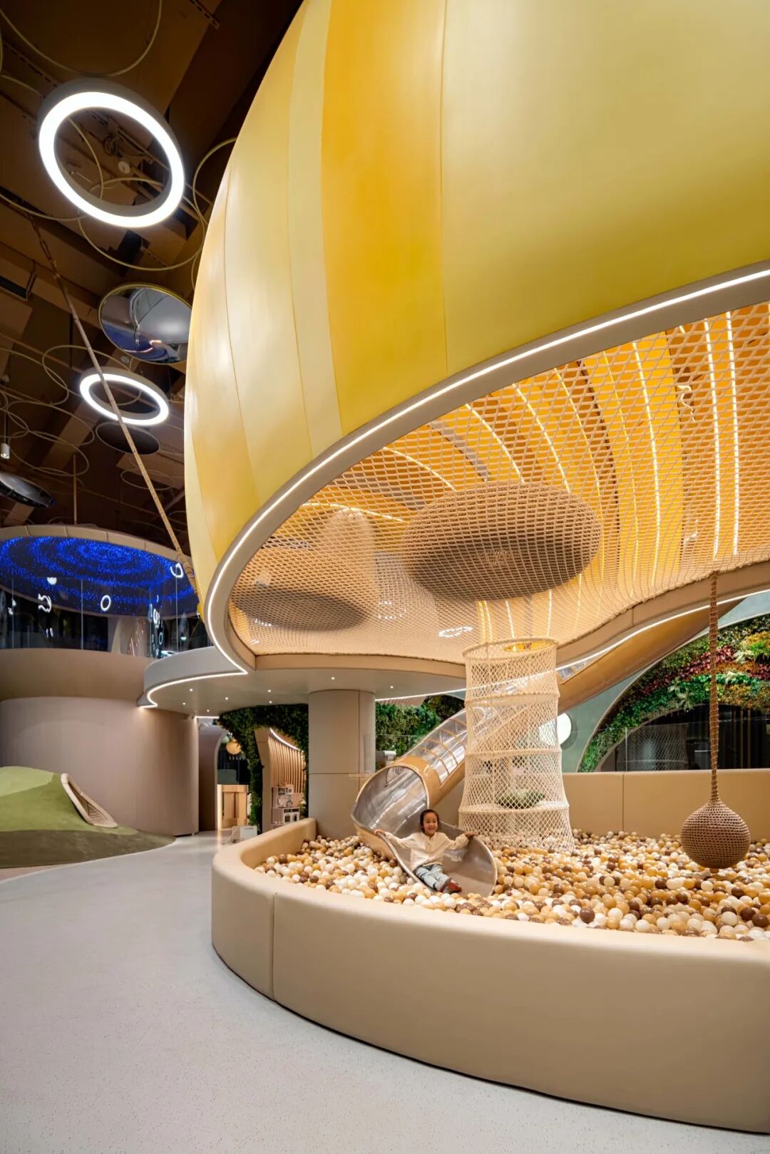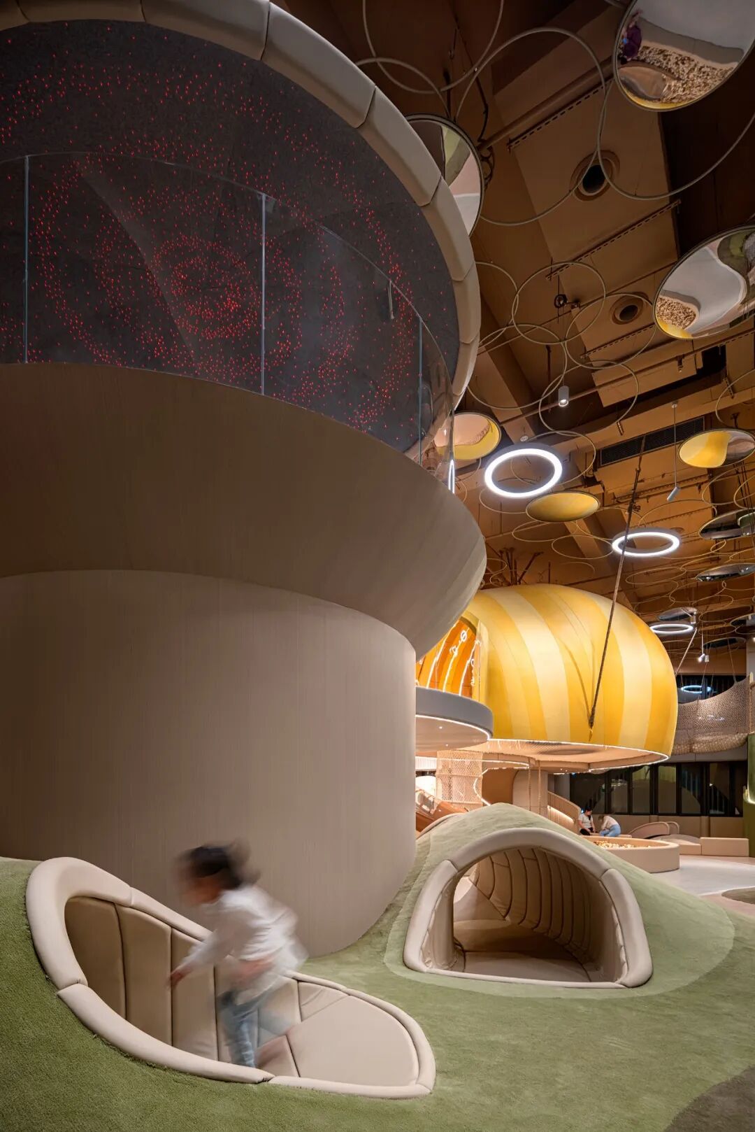 位于深圳南山公园的一栋独立建筑内,双层高体量的特点通过新建的夹层得到充分体现,为孩子们的自我探索创造垂直延伸和空间刺激。整个环境完全由曲线构成,打破了建筑外围边界的僵化,无缝连接了位于三个不同层次的所有活动区域。为了遵循曲线构造,模仿了山谷季节性变化的抽象景观,以激发孩子的想象力。整体设计语言是对象征性颜色、形状、比例和触感的策略性操作,以满足游乐场的功能和情感需求,并为孩子和父母带来难忘的体验。