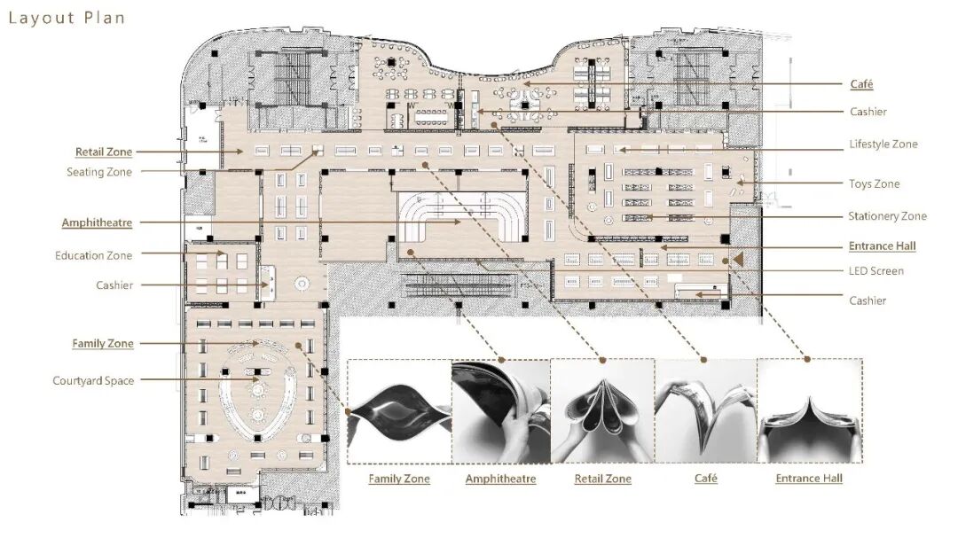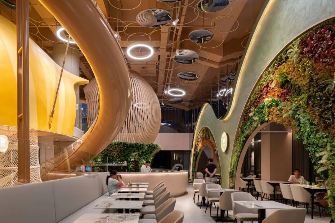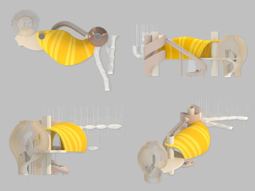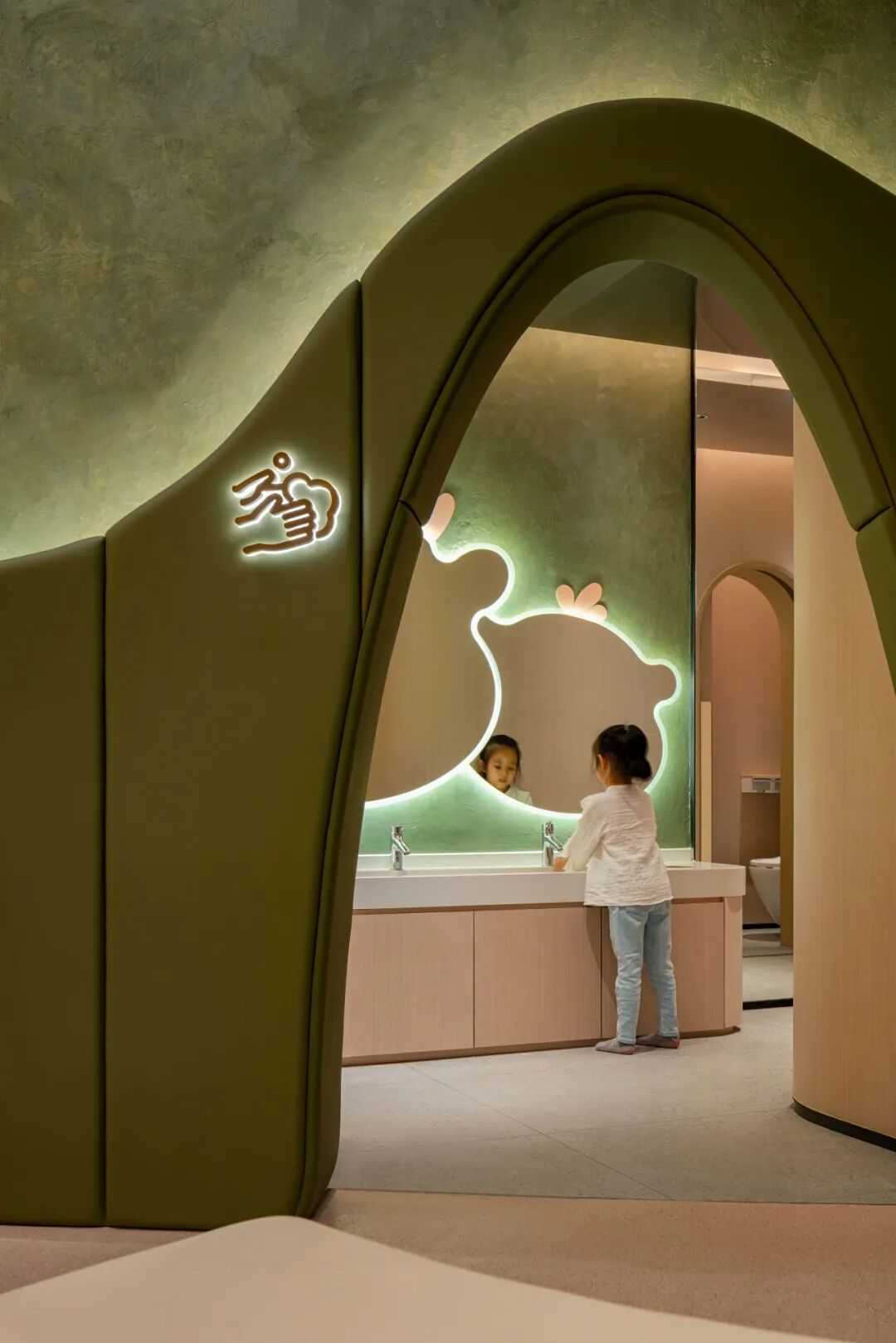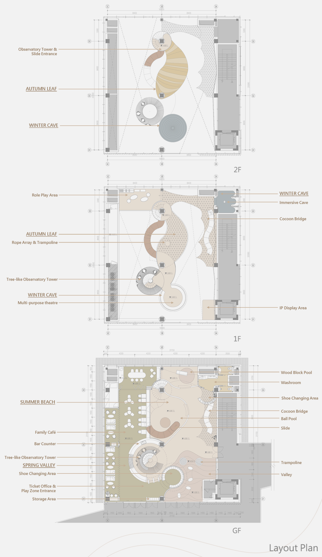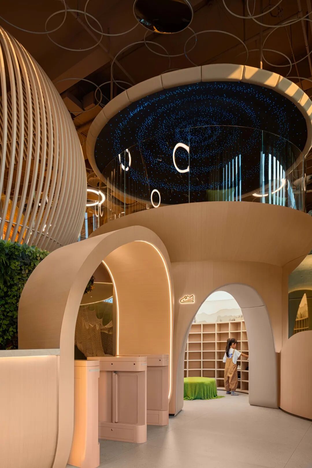 位于深圳南山公园的一栋独立建筑内,双层高体量的特点通过新建的夹层得到充分体现,为孩子们的自我探索创造垂直延伸和空间刺激。整个环境完全由曲线构成,打破了建筑外围边界的僵化,无缝连接了位于三个不同层次的所有活动区域。为了遵循曲线构造,模仿了山谷季节性变化的抽象景观,以激发孩子的想象力。整体设计语言是对象征性颜色、形状、比例和触感的策略性操作,以满足游乐场的功能和情感需求,并为孩子和父母带来难忘的体验。