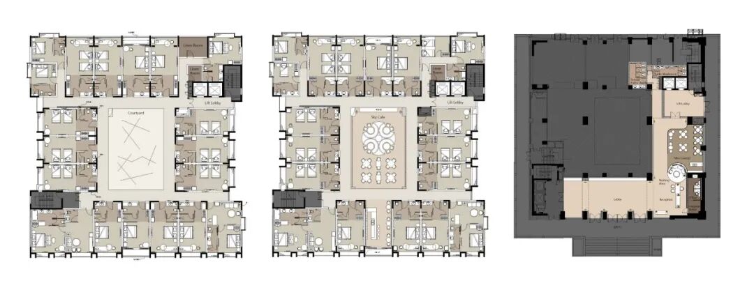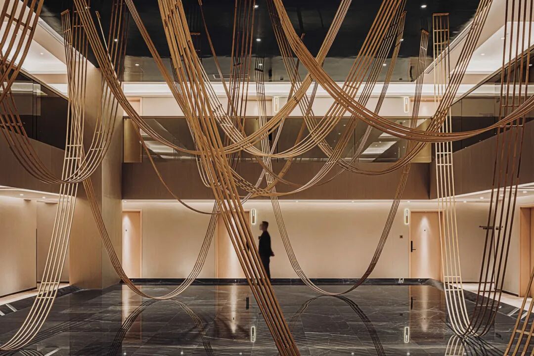 每两层客房都引入了双高中央庭院。一个反射性的湖面,竹制的舞蹈曲线自然落下,仿佛在空中漂浮着云朵。这种天花板悬挂结构再次与竹编织大师协商如何利用其自然弹性和传统连接方法创建曲线。到达房间前,客人会感觉像穿过一片抽象的竹林。